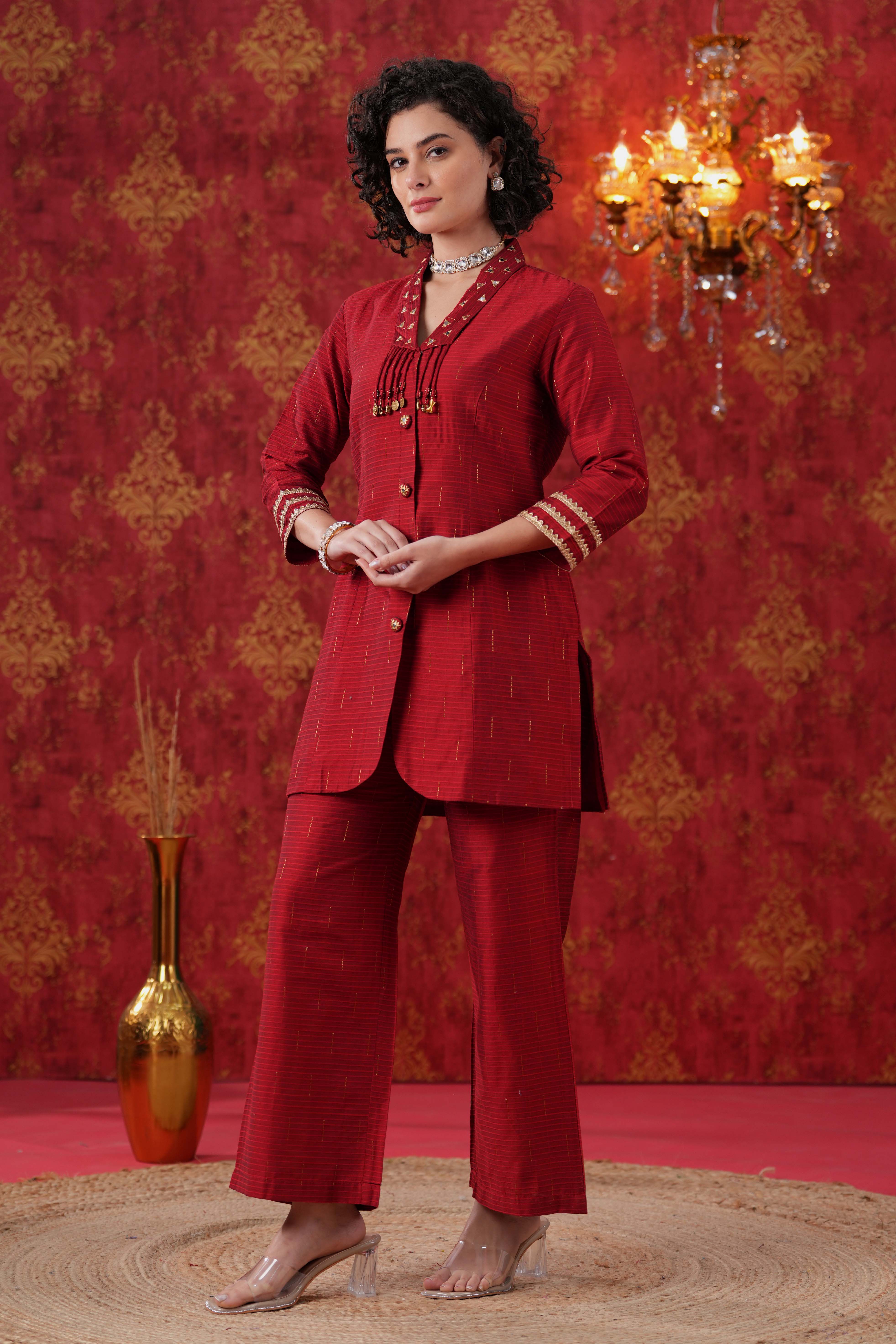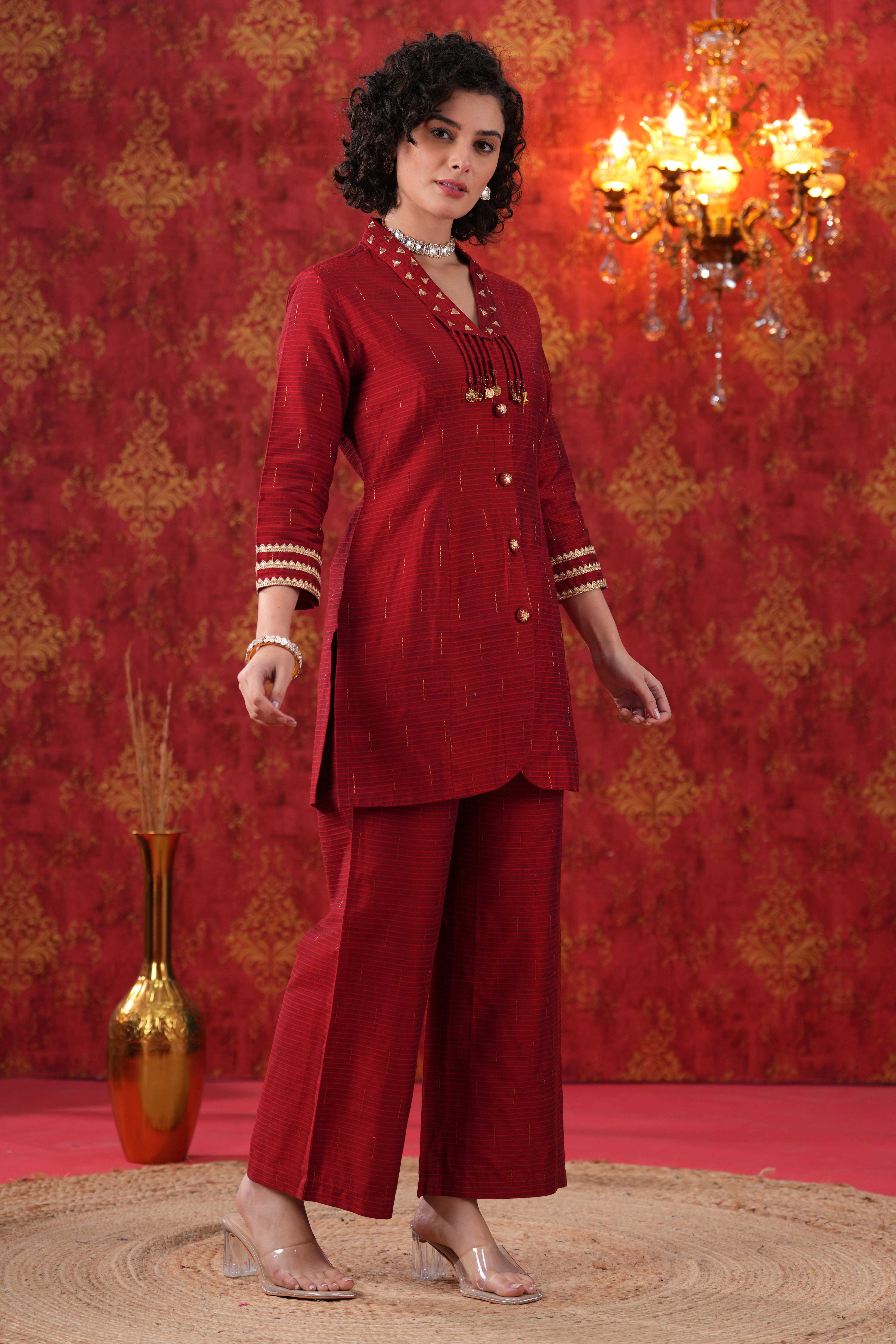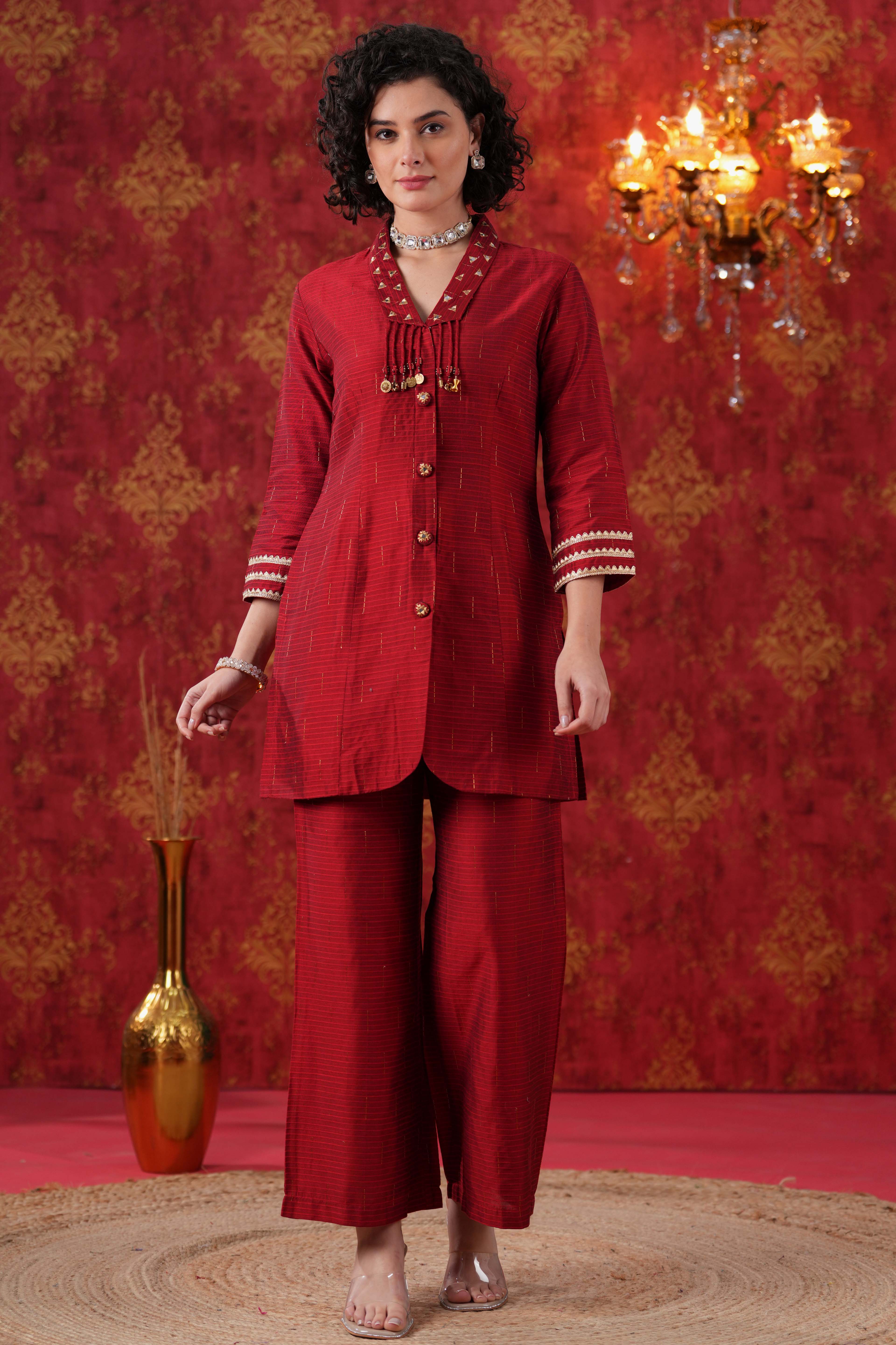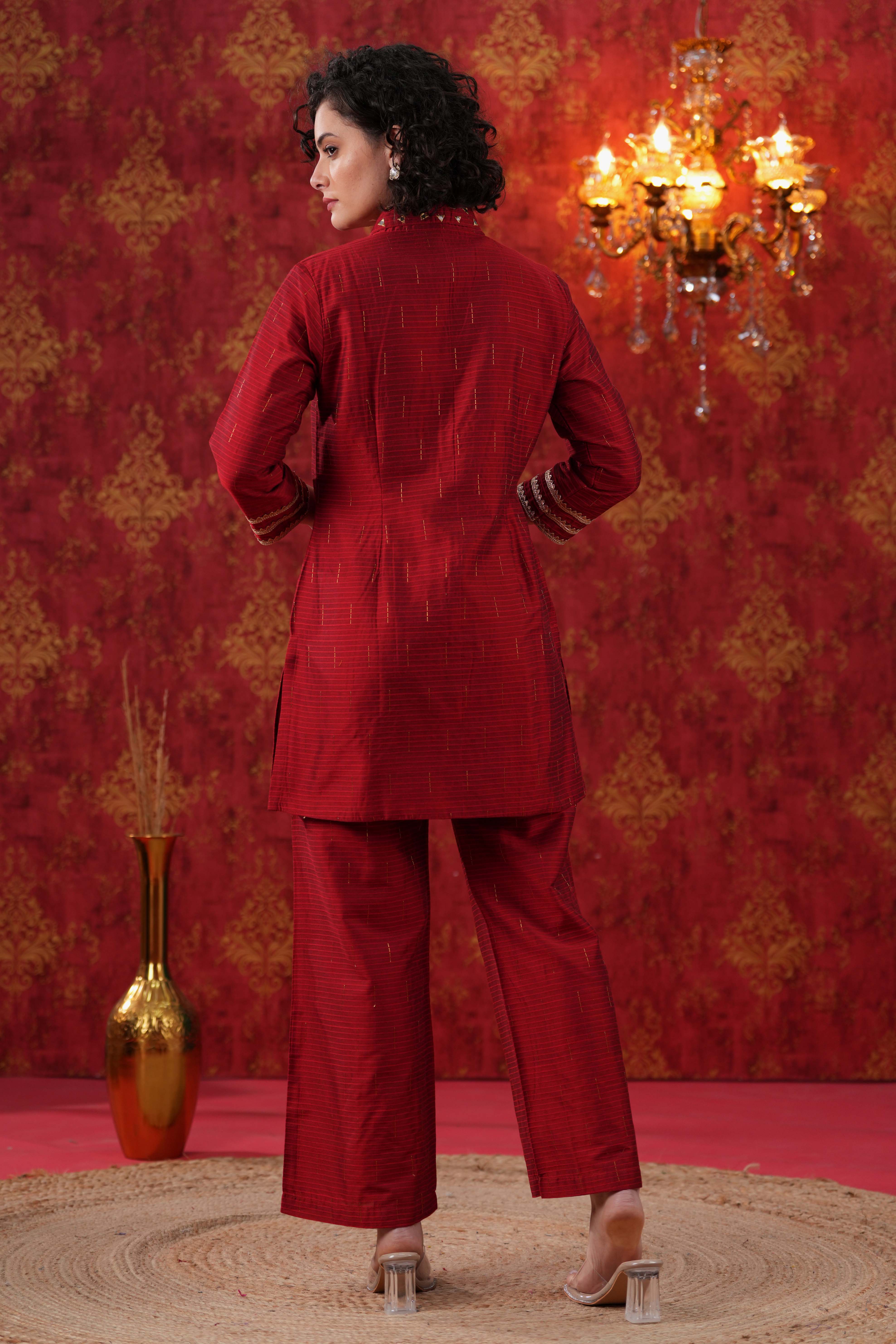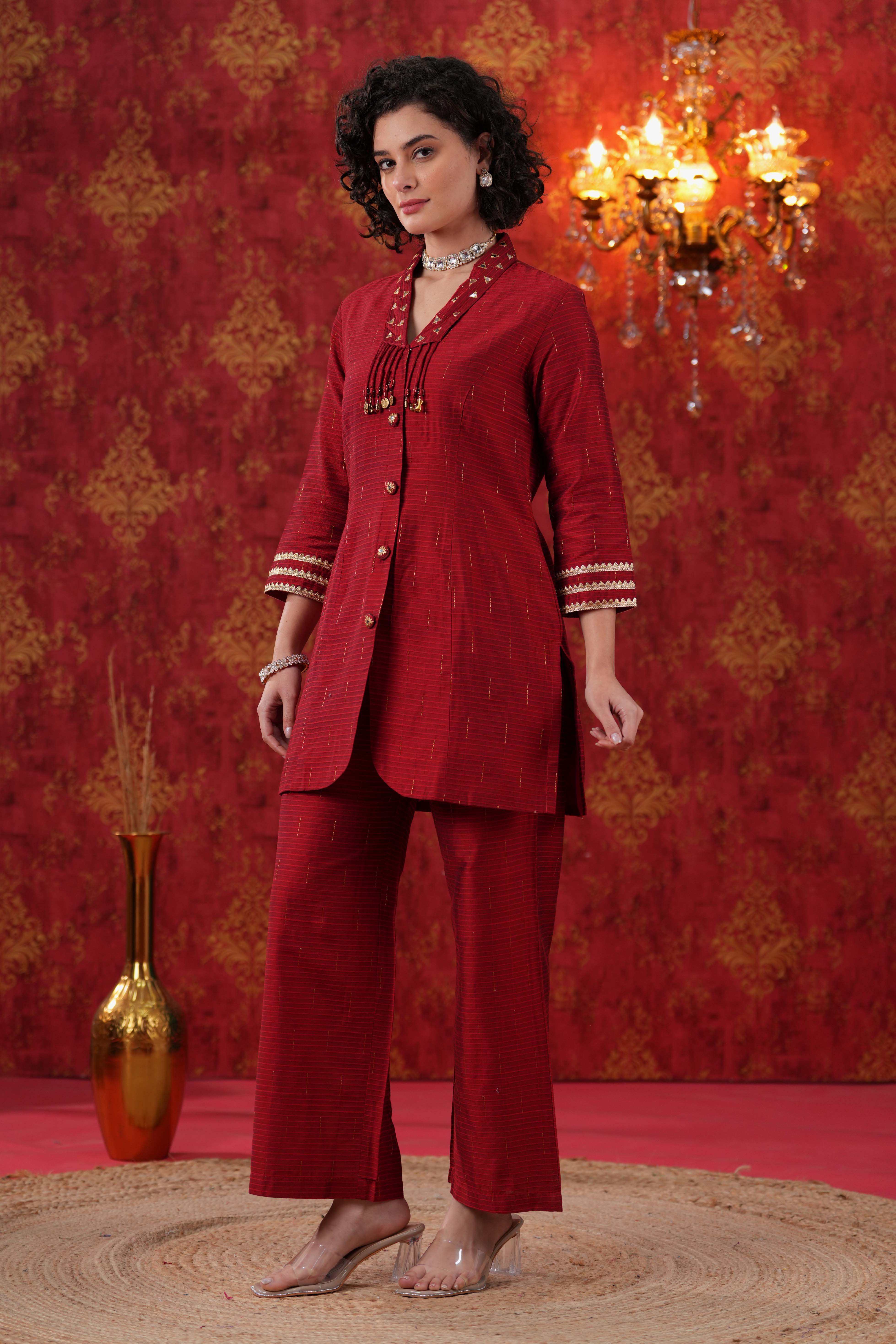 Desi Disco Red Glitz Red Jacket Co-ord Set- Shine bright in the Desi Disco Glitz Red Co-ord Set. Crafted from luxe cotton silk, it features a mirror-embellished jacket with zari-detailed sleeves and sleek palazzos—perfect for festive soirées and celebrations. A bold blend of tradition and contemporary flair.