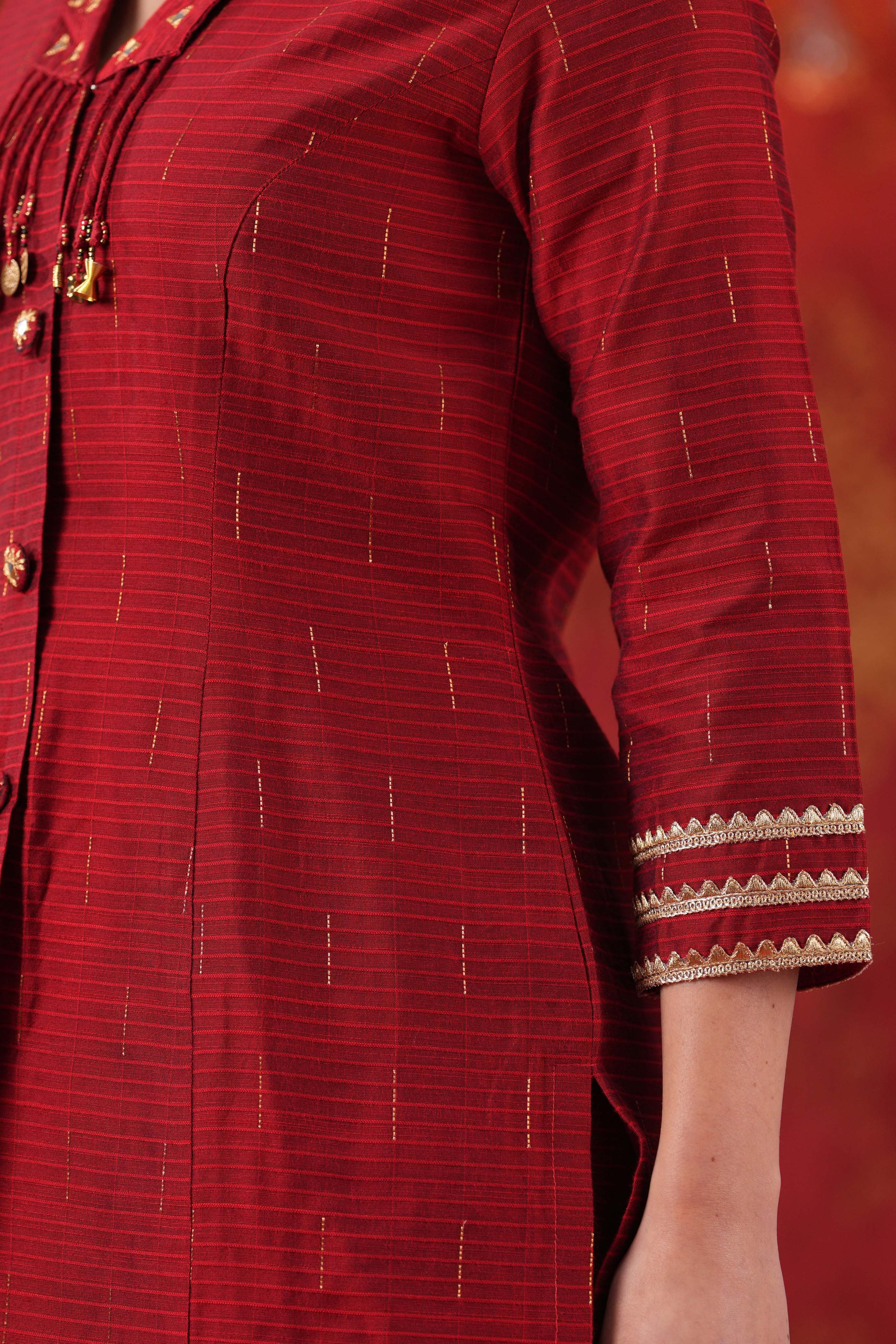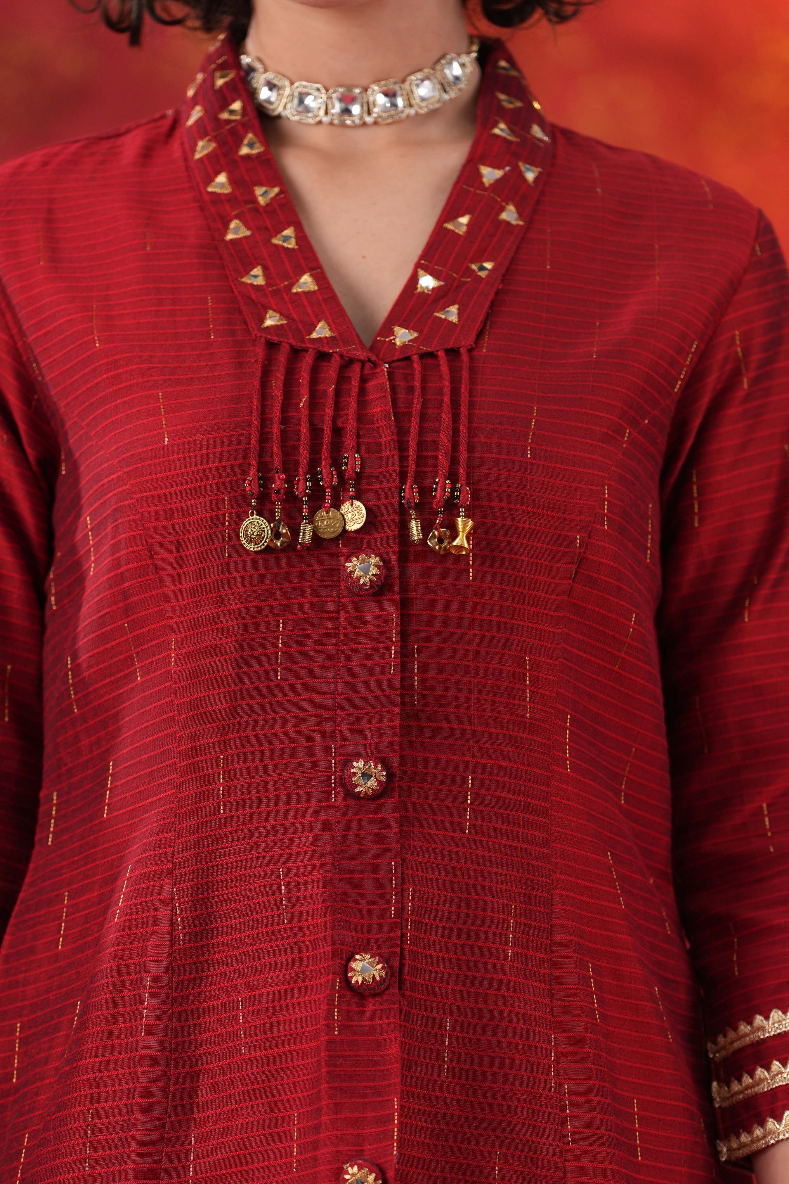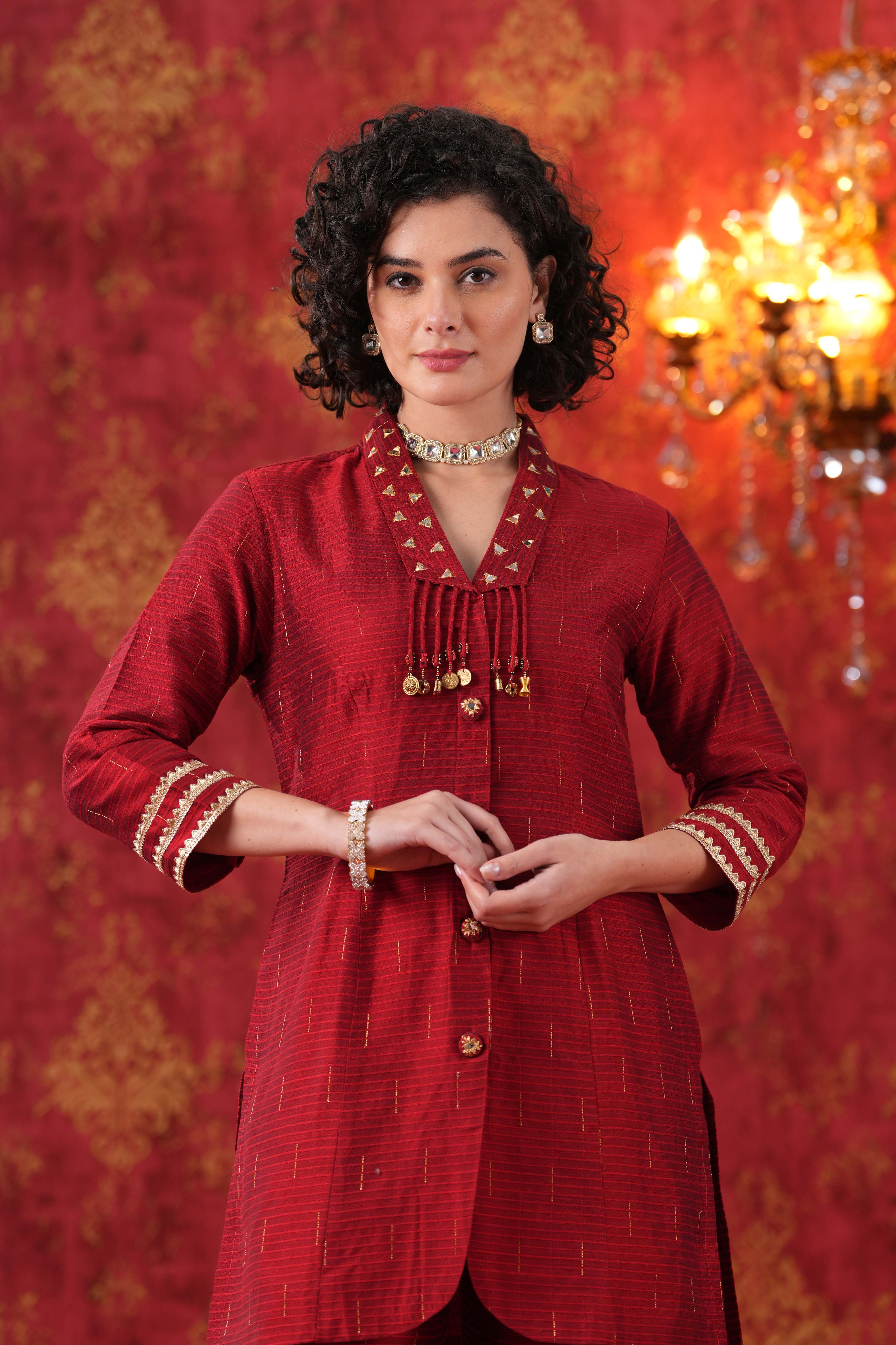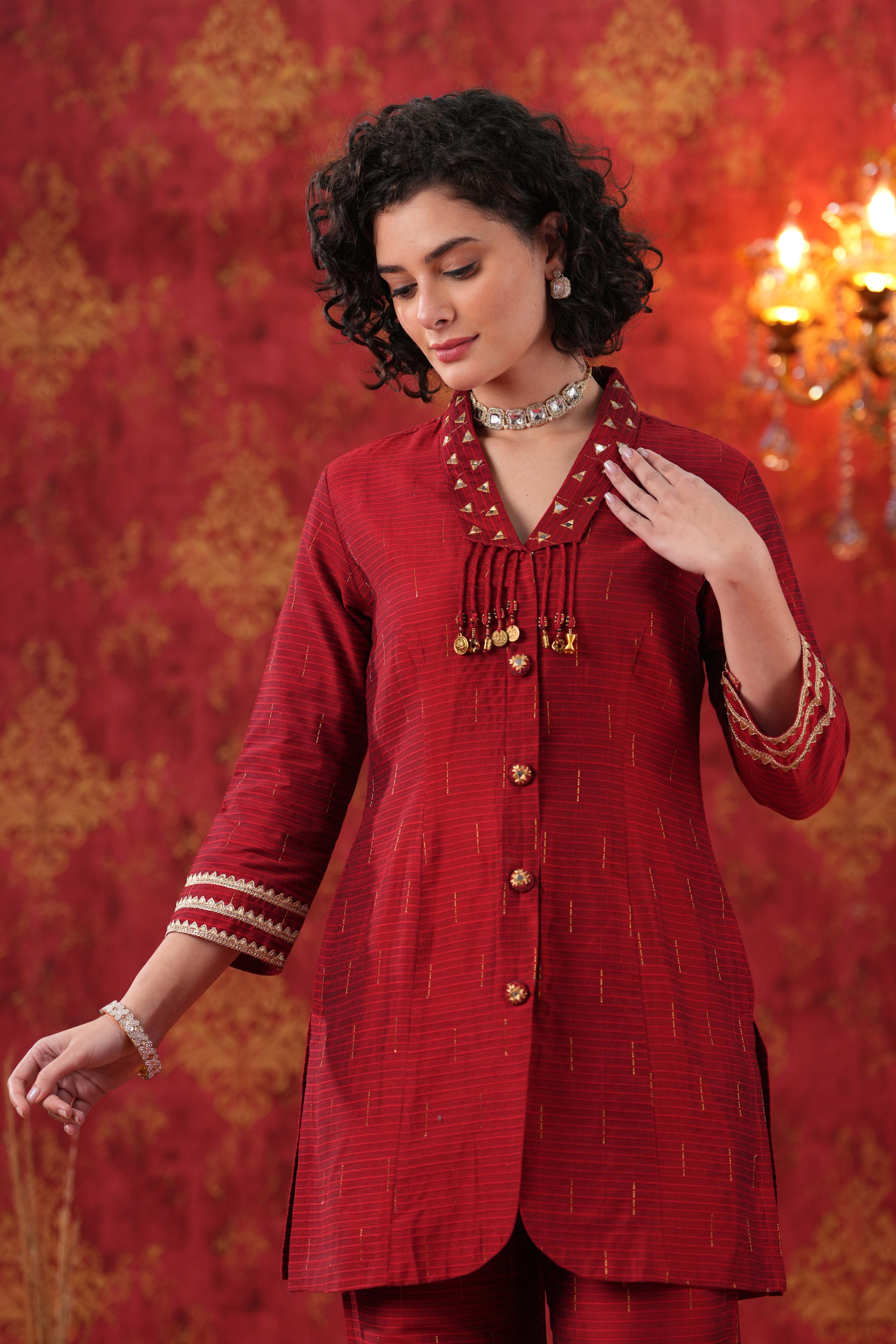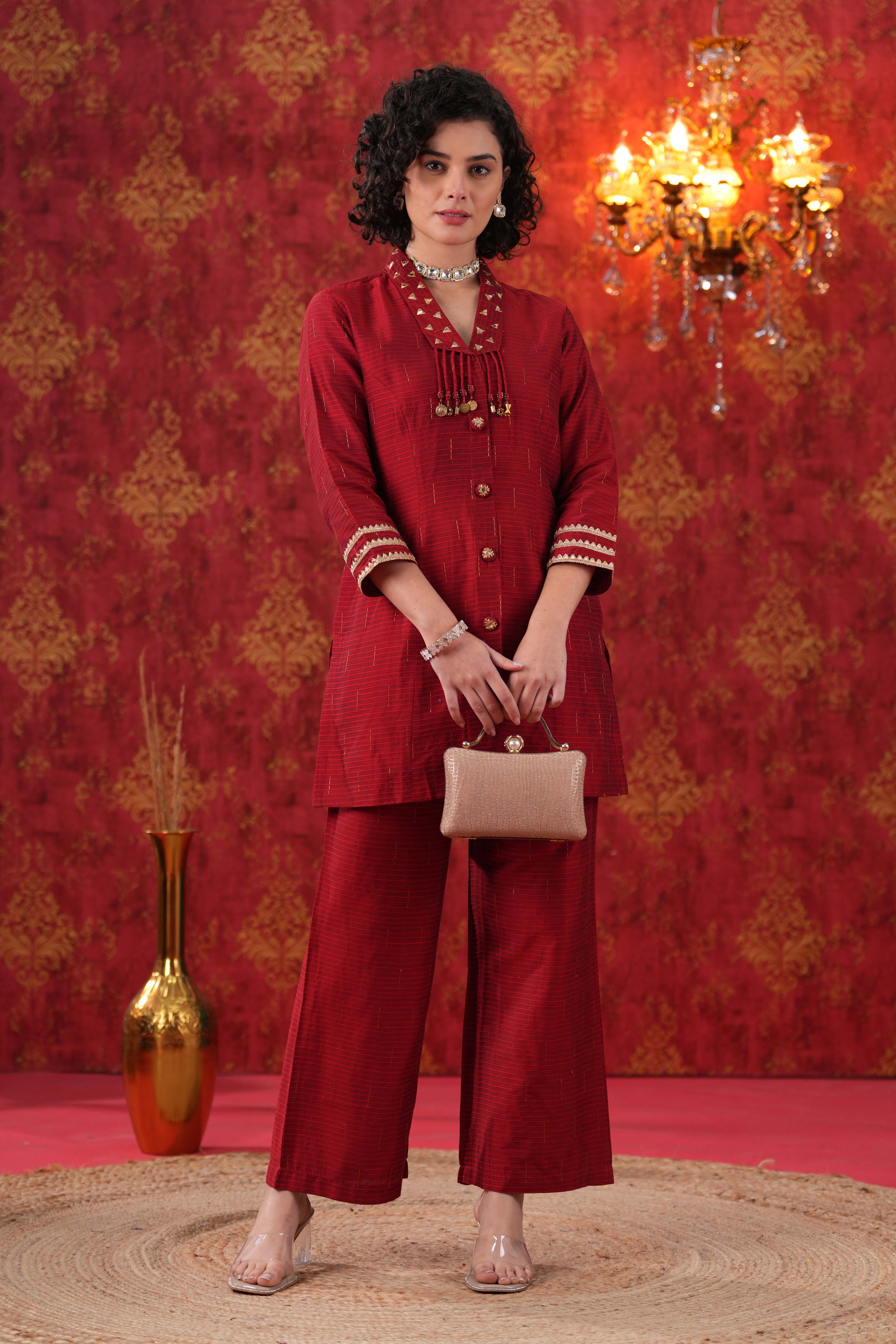 Desi Disco Red Glitz Red Jacket Co-ord Set- Shine bright in the Desi Disco Glitz Red Co-ord Set. Crafted from luxe cotton silk, it features a mirror-embellished jacket with zari-detailed sleeves and sleek palazzos—perfect for festive soirées and celebrations. A bold blend of tradition and contemporary flair.