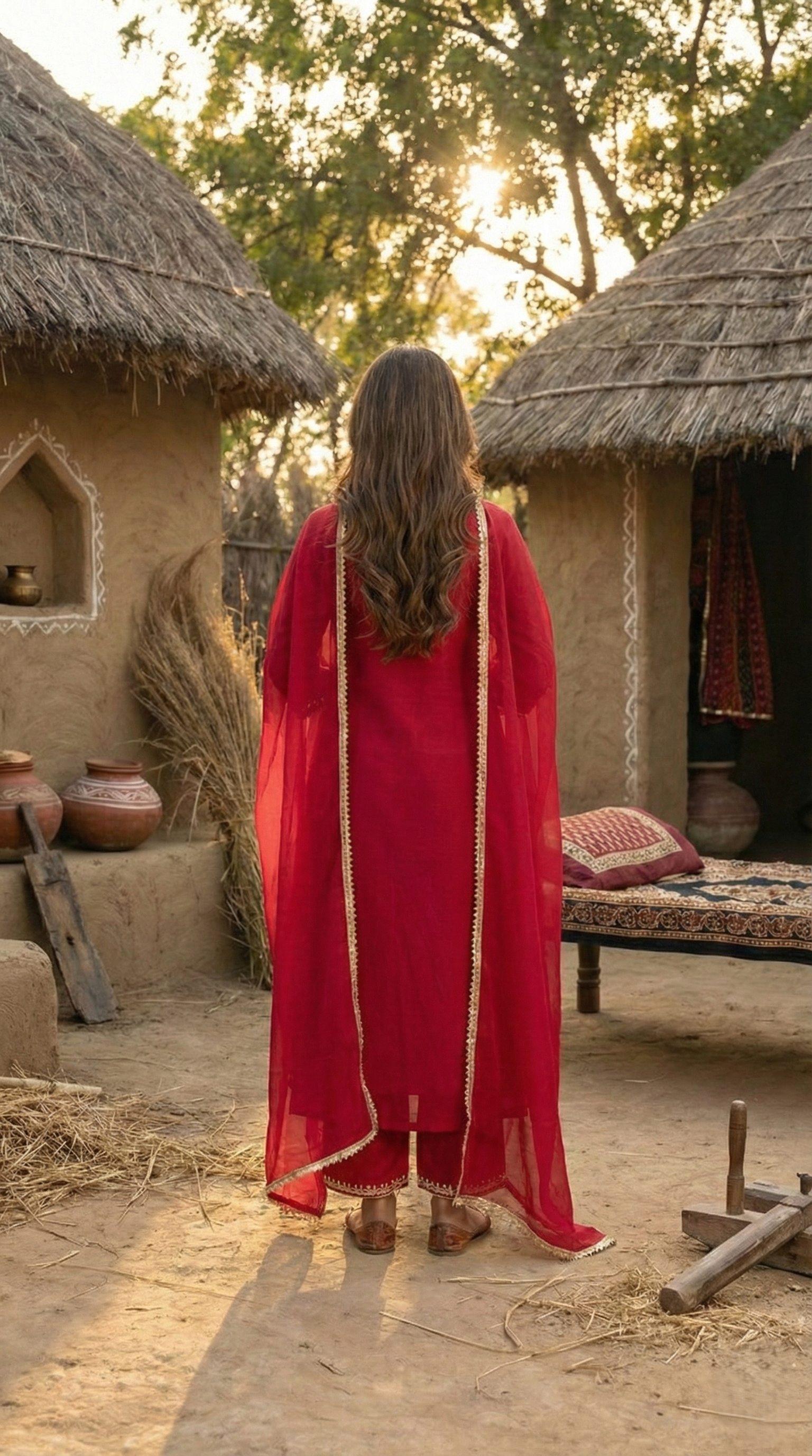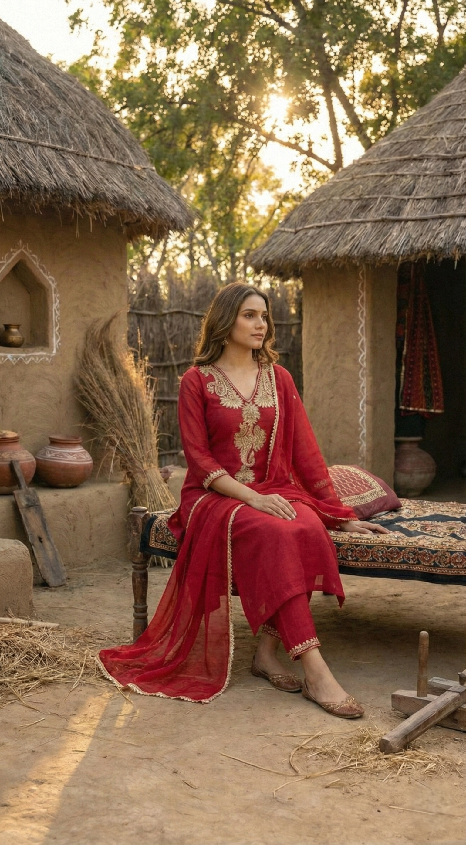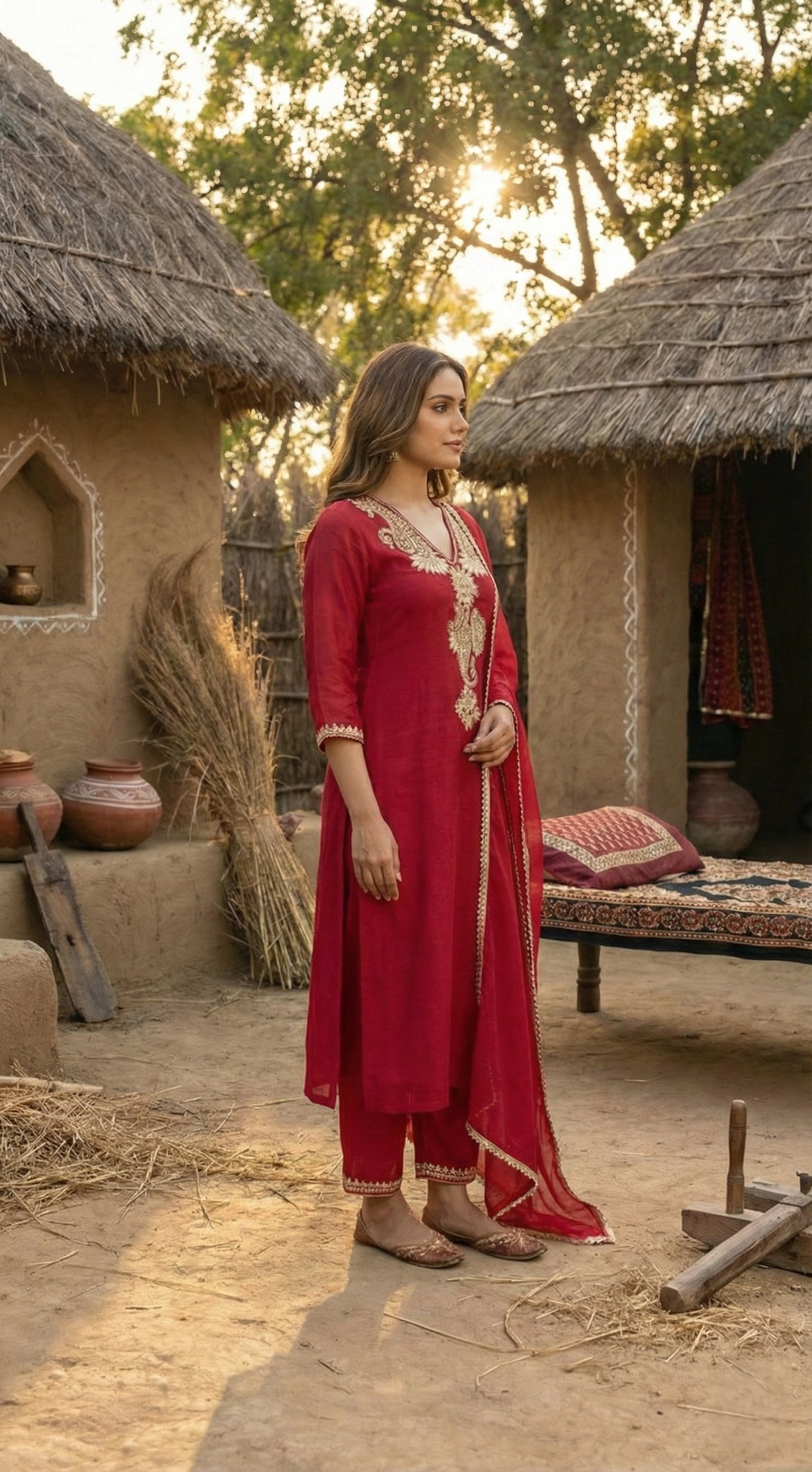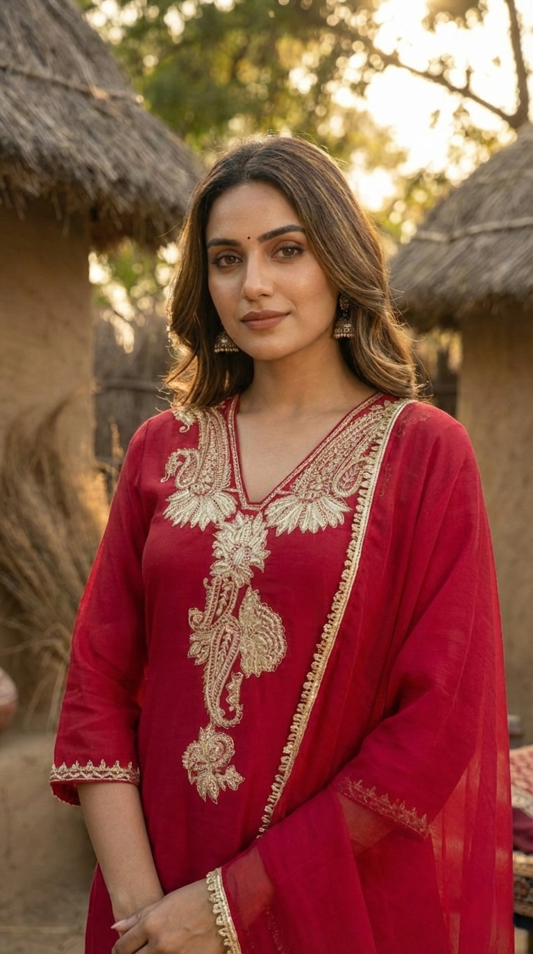 Step into a world of timeless elegance with this Red A-line flared kurta, designed to create a silhouette of majestic movement. The garment features a sophisticated V-neckline, lavishly adorned with intricate Zari embroidered front detailing that reflects a regal, golden luminescence. This artisanal craftsmanship extends to the borders, infusing the traditional design with a touch of modern grandeur. The kurta is perfectly harmonized with solid palazzos, offering a voluminous yet structured counterpoint that ensures effortless poise. To complete this sartorial masterpiece, a pure cotton mulmul dupatta is draped with ethereal lightness, its soft texture providing a delicate finish to the rich ensemble. Whether for a festive gala or an intimate heritage celebration, this outfit promises an aura of unparalleled sophistication and artisanal charm.