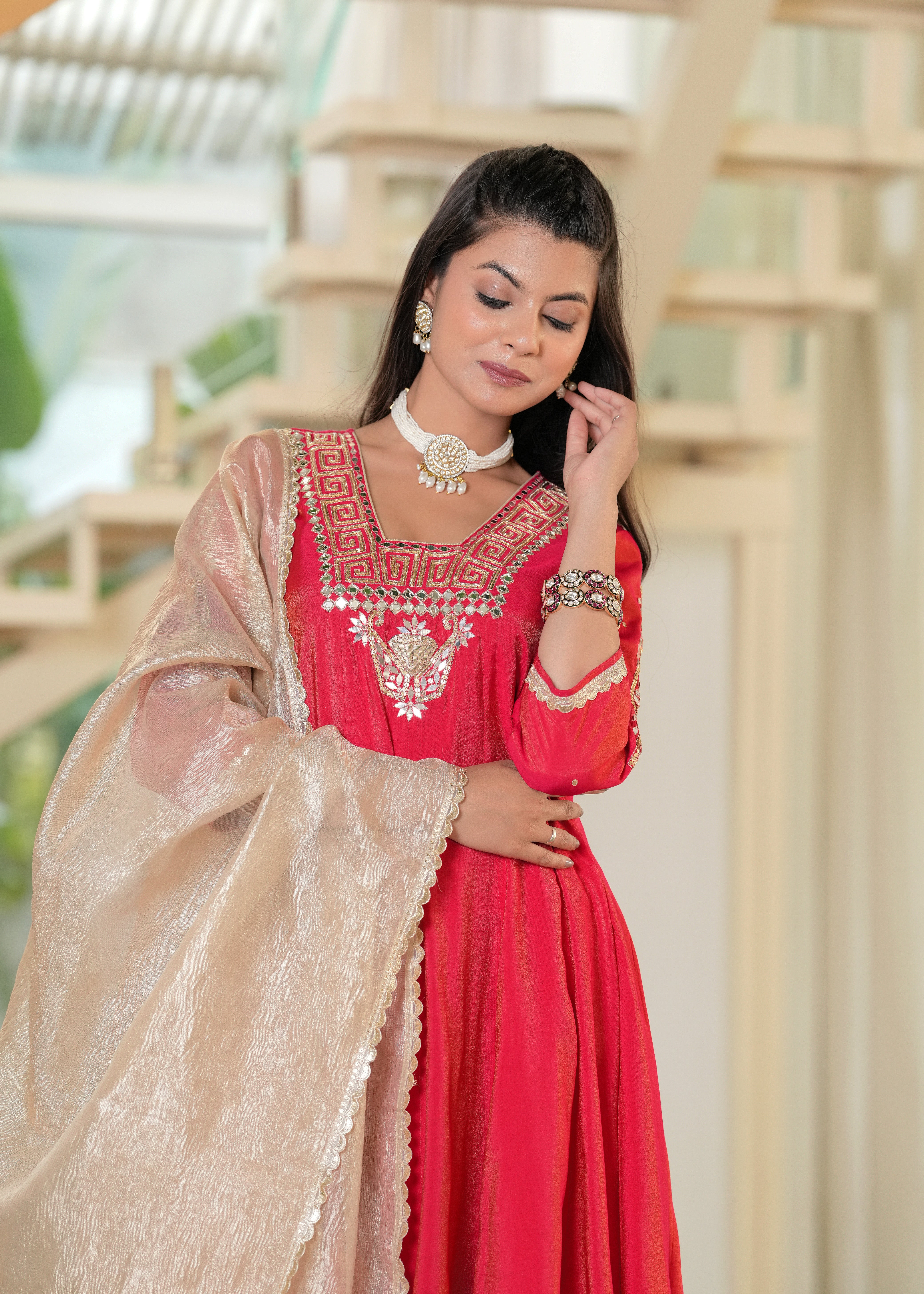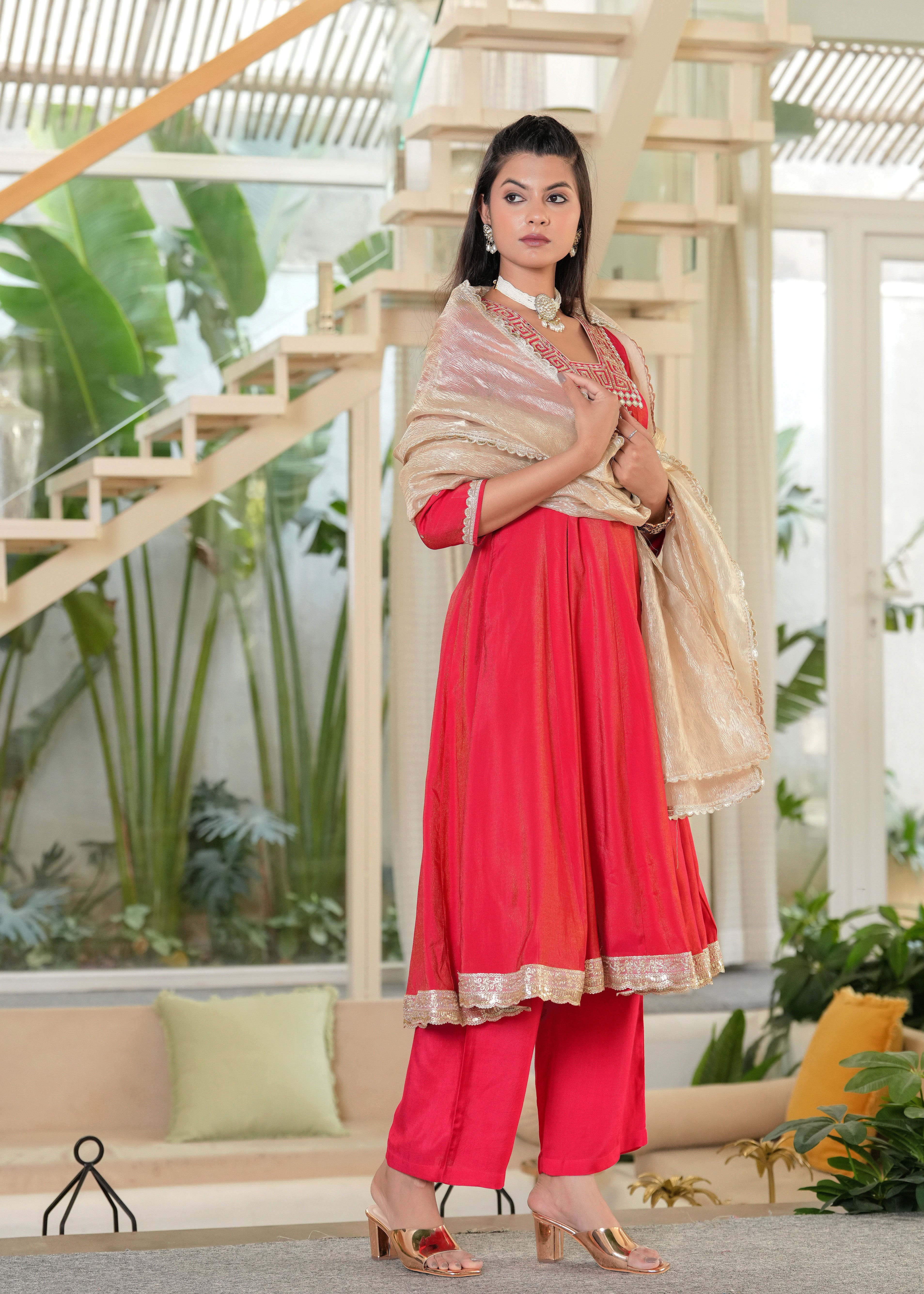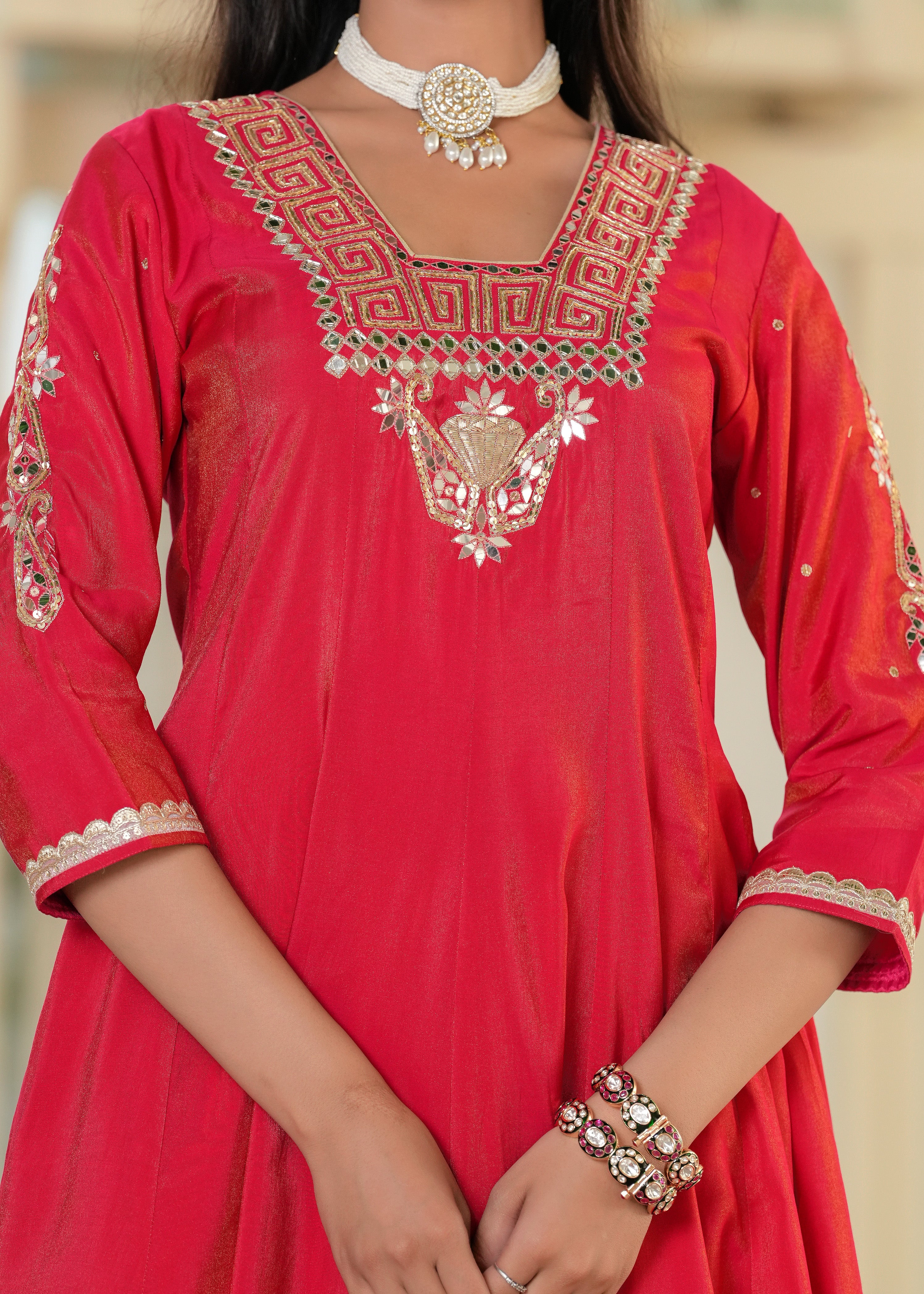 Maharani Vibes Red Sindoori Mirror Work Anarkali Set with Tissue Dupatta- Unveil royal allure in this Sindoori red Polina shimmer Anarkali, featuring a paneled A-line silhouette, glass neckline, and 3/4 sleeves. Embellished with mirror work, sequins, and zardozi, it pairs with red shantoon palazzos and a gold crush tissue dupatta, perfect for grand celebrations.