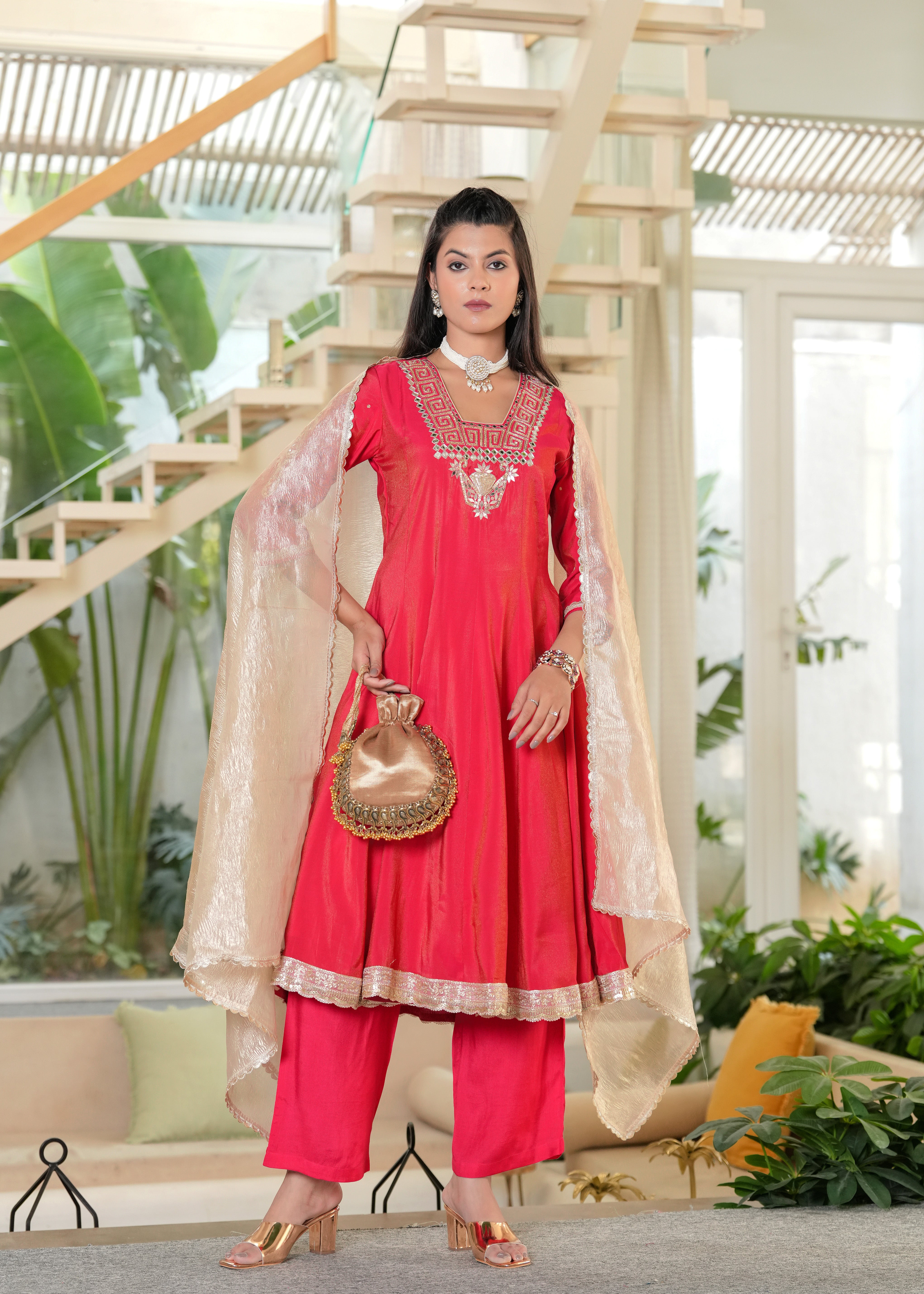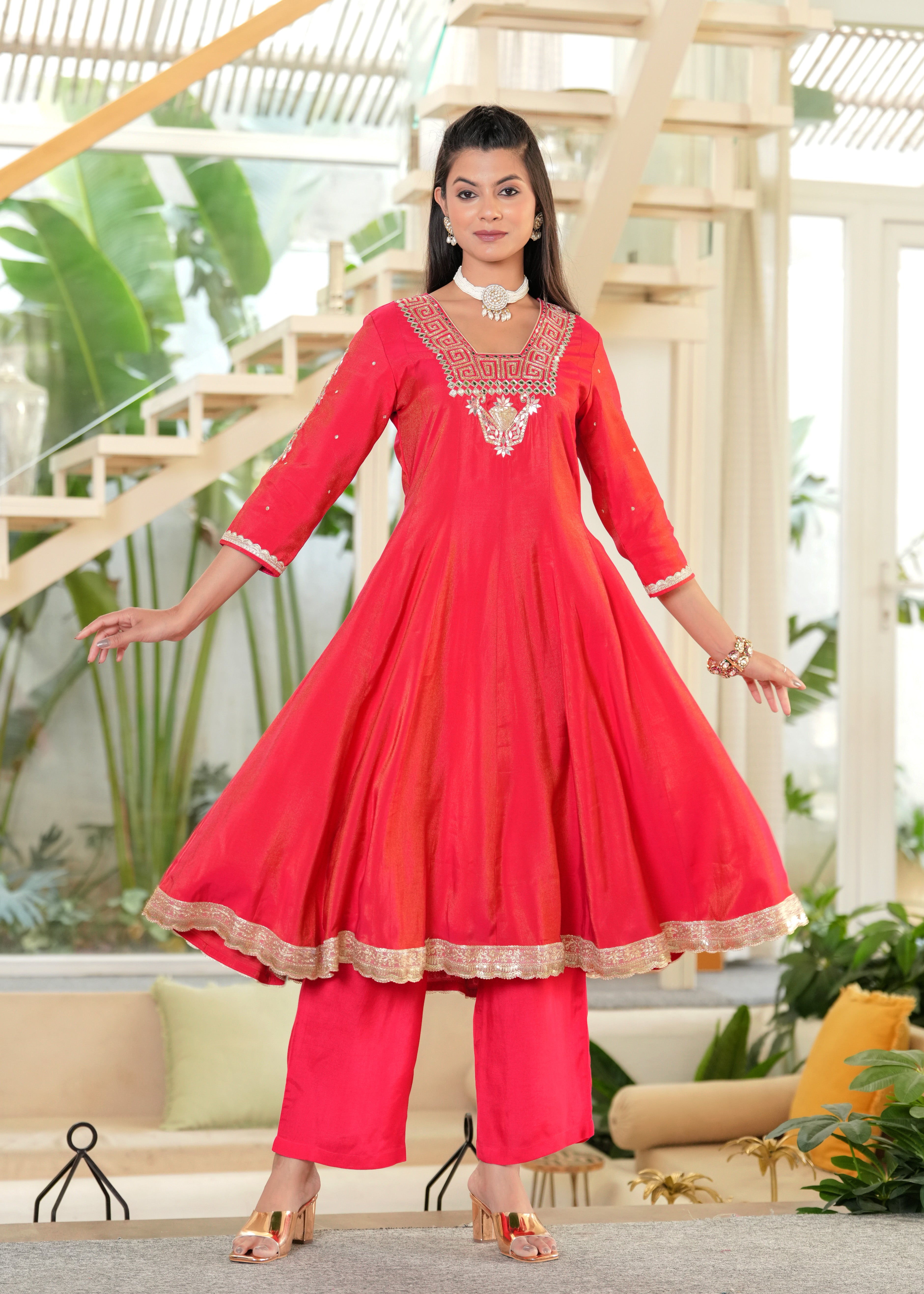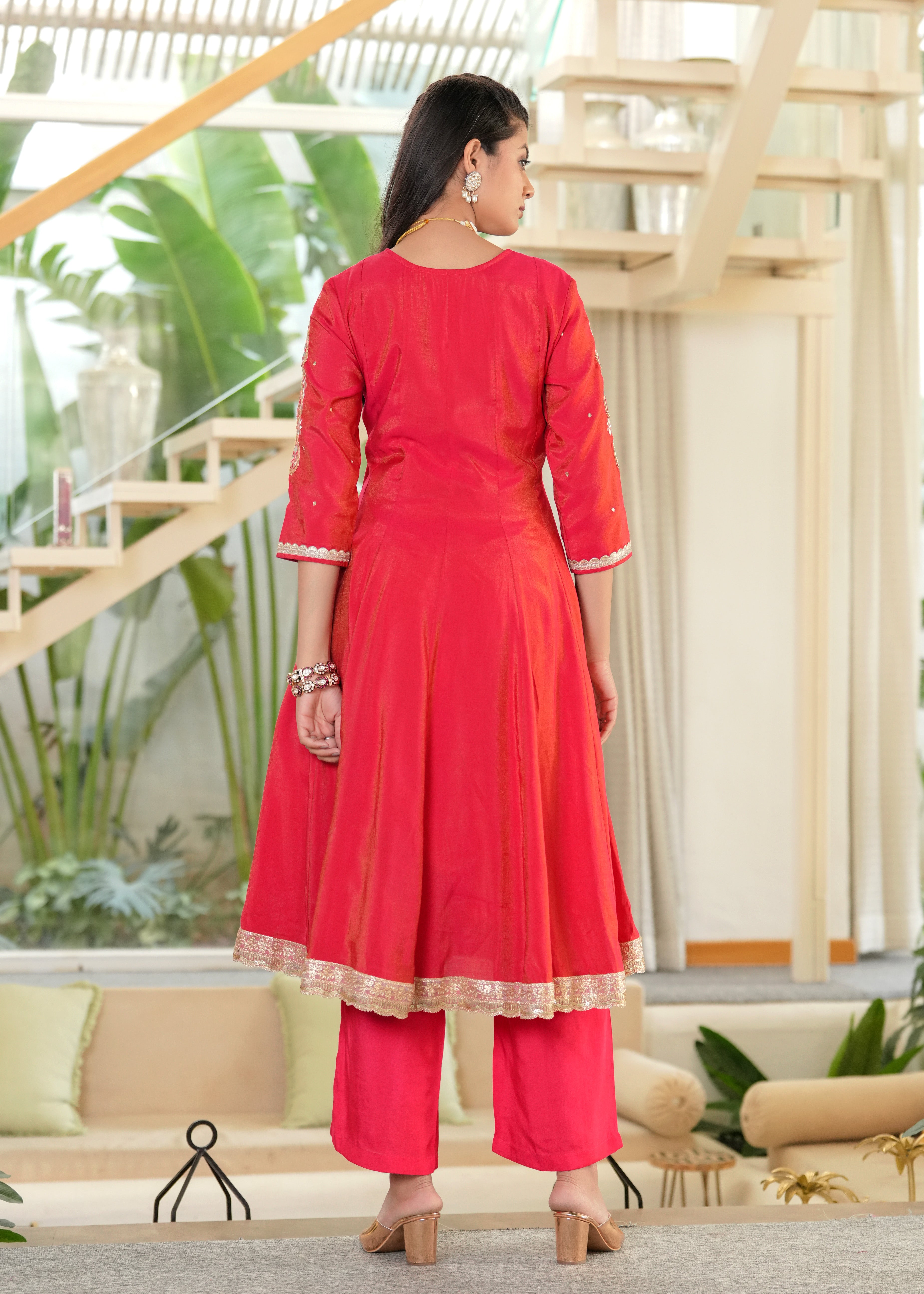 Maharani Vibes Red Sindoori Mirror Work Anarkali Set with Tissue Dupatta- Unveil royal allure in this Sindoori red Polina shimmer Anarkali, featuring a paneled A-line silhouette, glass neckline, and 3/4 sleeves. Embellished with mirror work, sequins, and zardozi, it pairs with red shantoon palazzos and a gold crush tissue dupatta, perfect for grand celebrations.