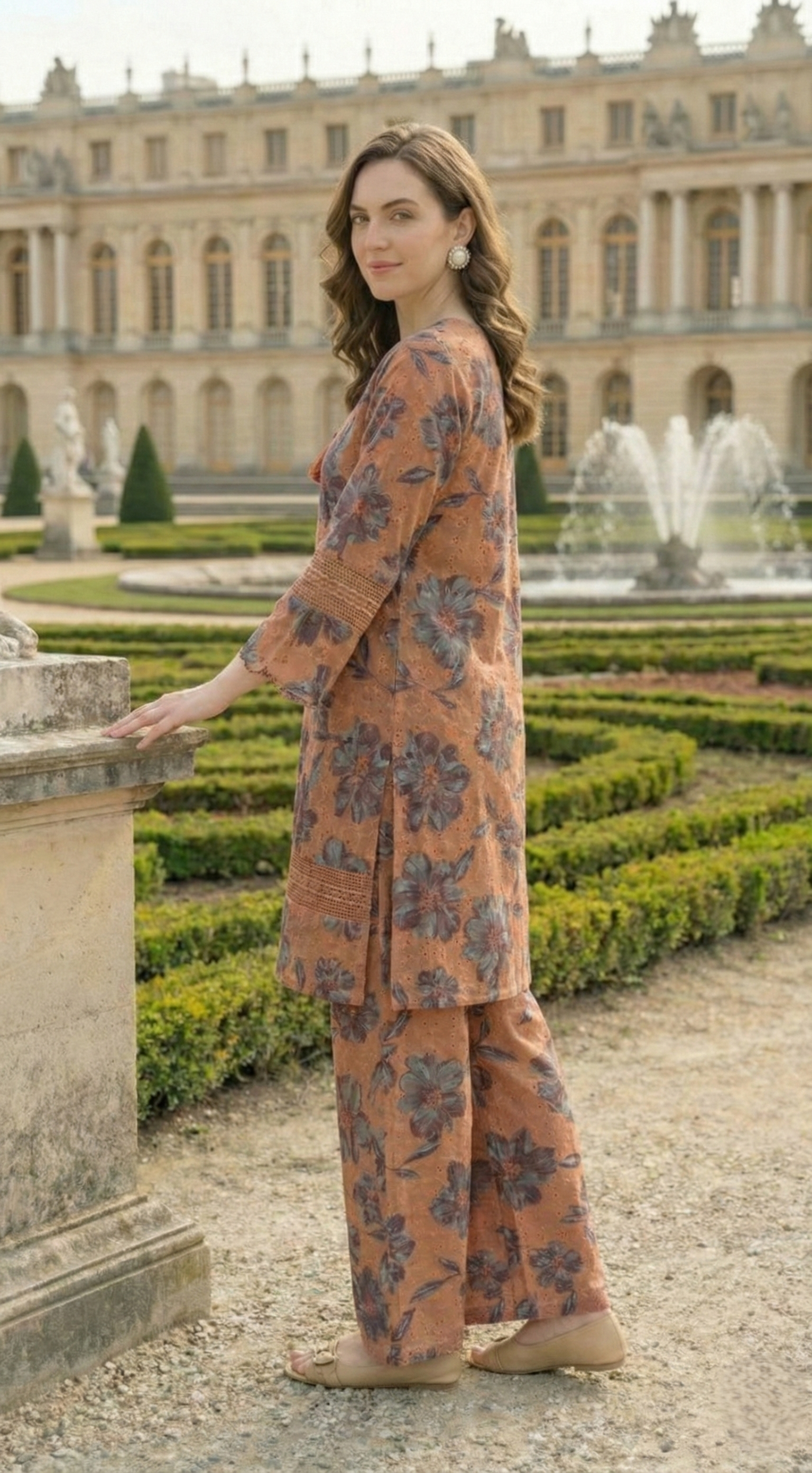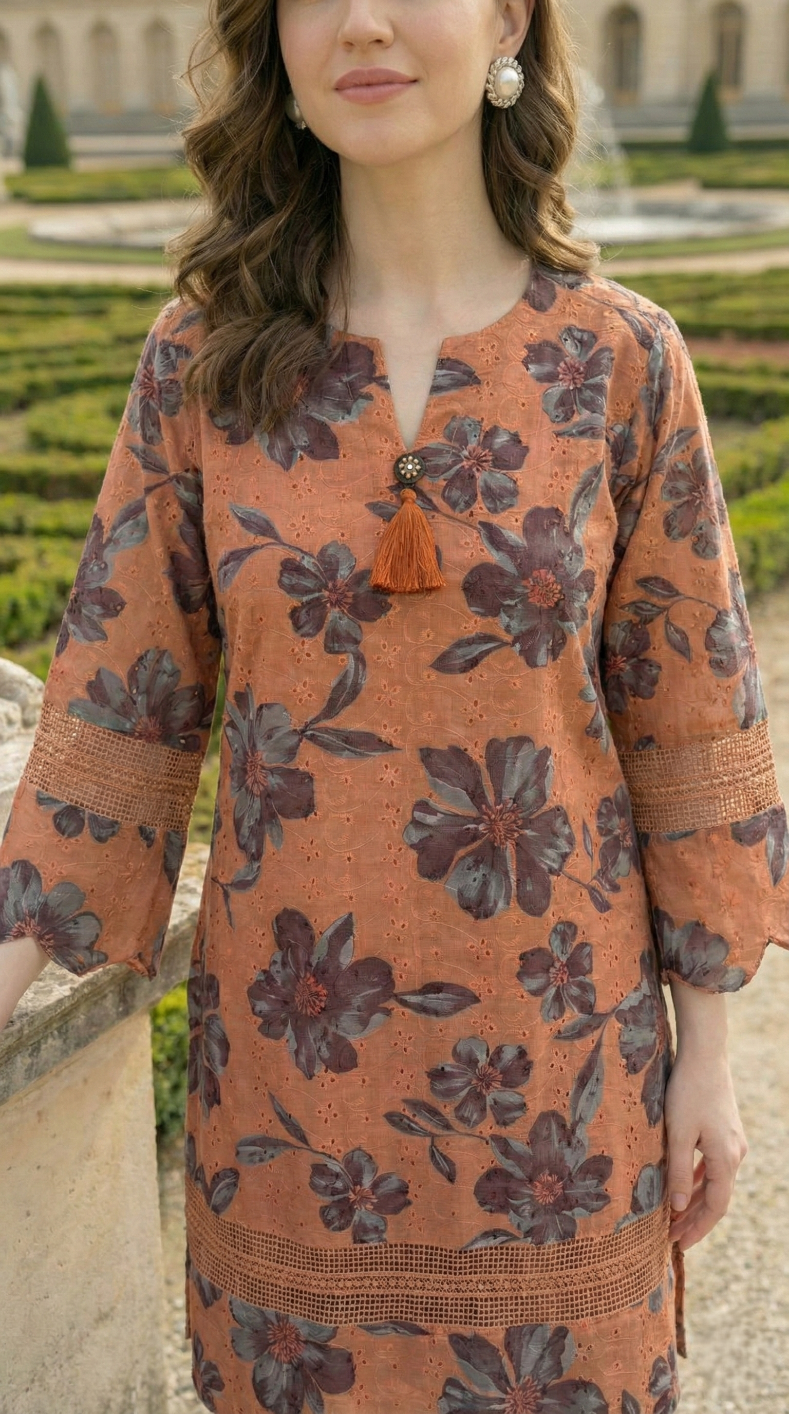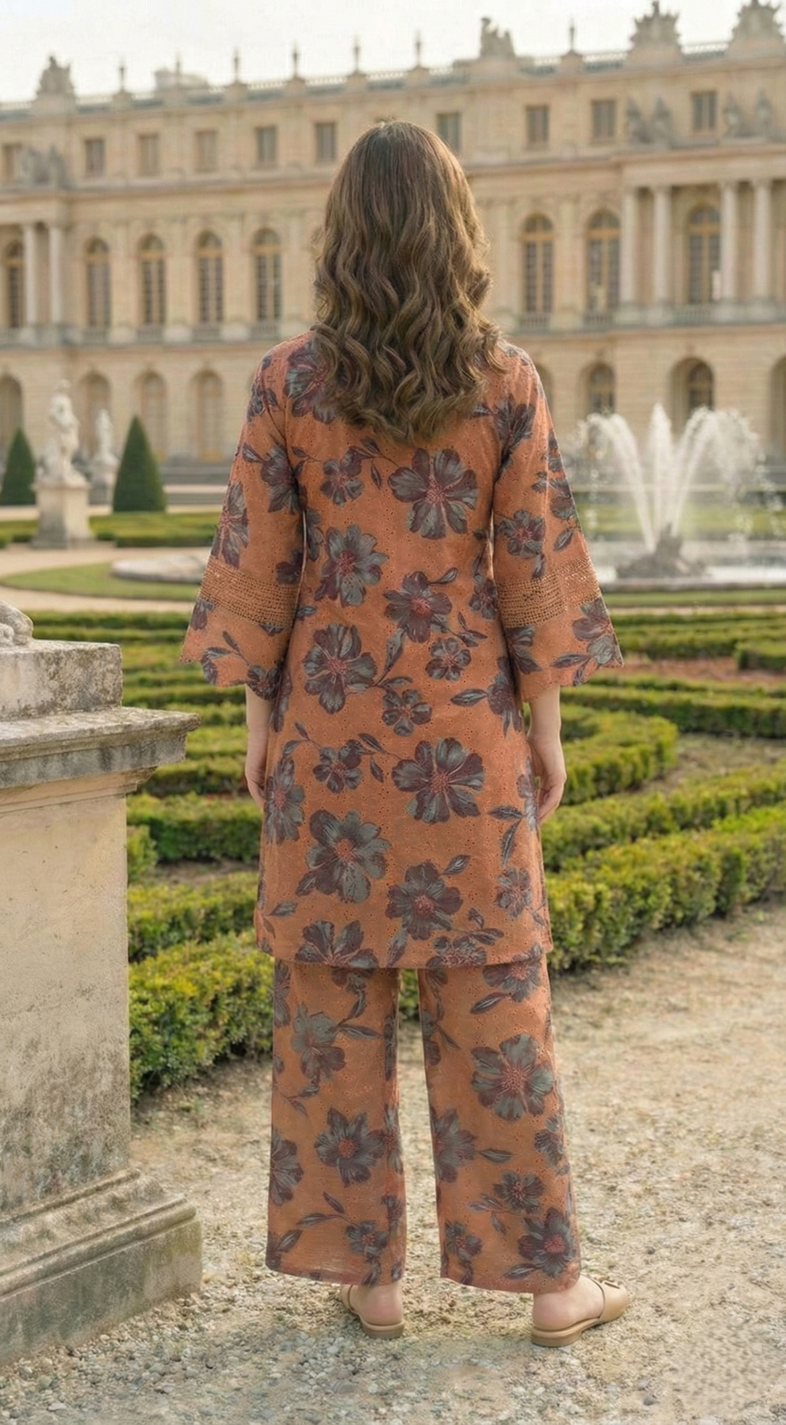Designed for casual celebrations and daytime wear, this lightweight cotton kurta set feels breathable while adding a rich, earthy tone. The round-neck kurta with a V-slit, scallops, and lace detailing pairs with printed palazzos for a cohesive, relaxed silhouette.