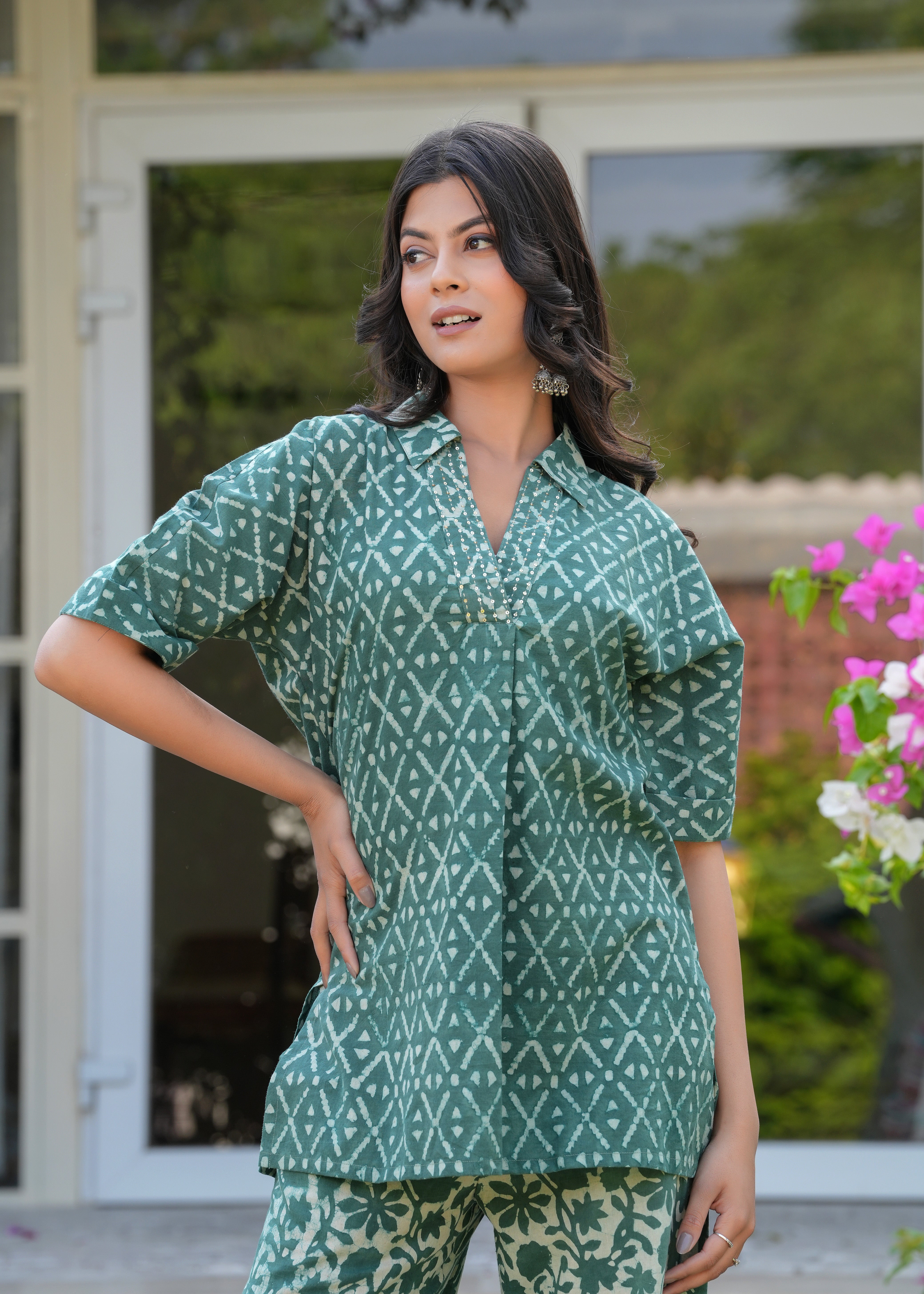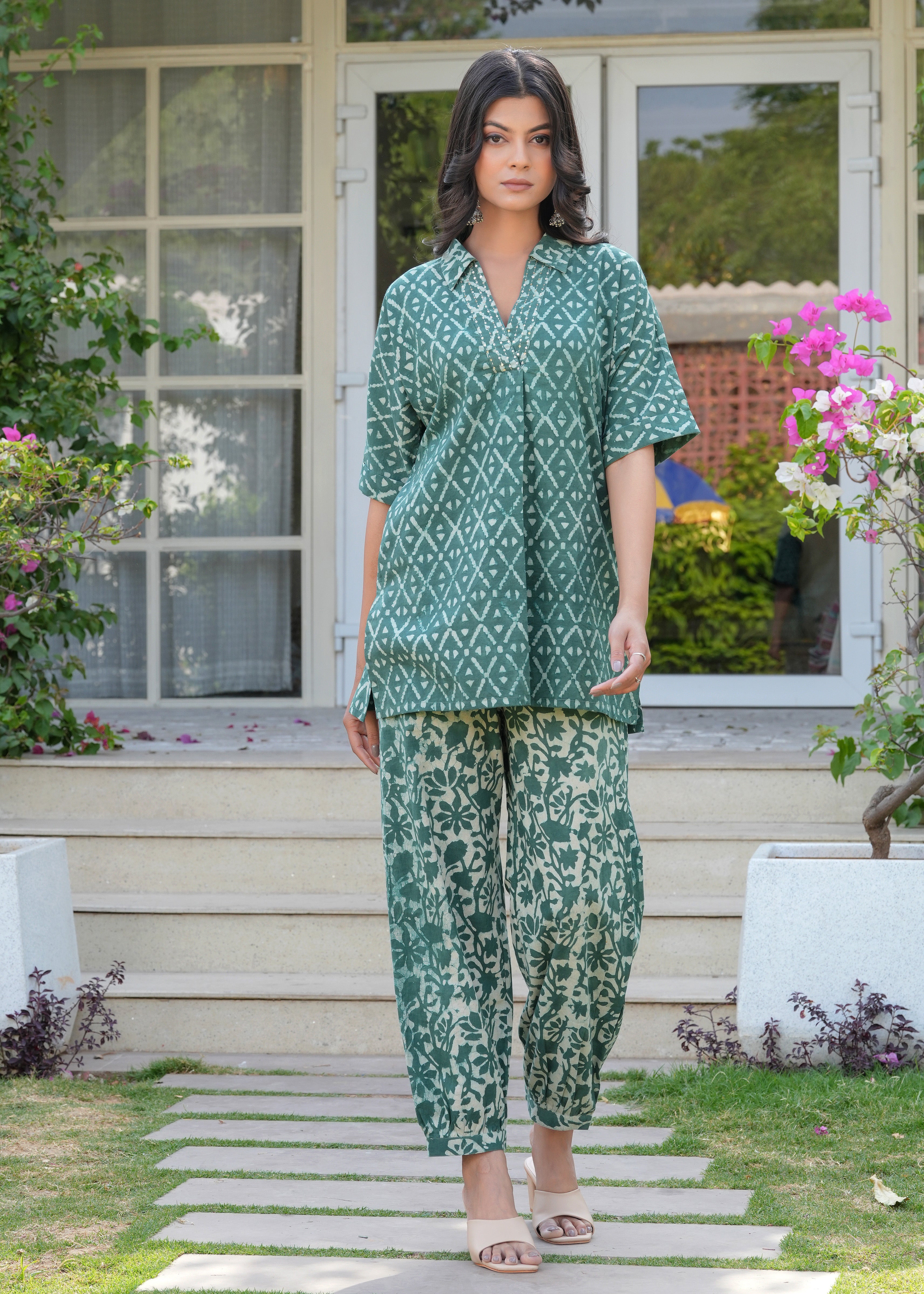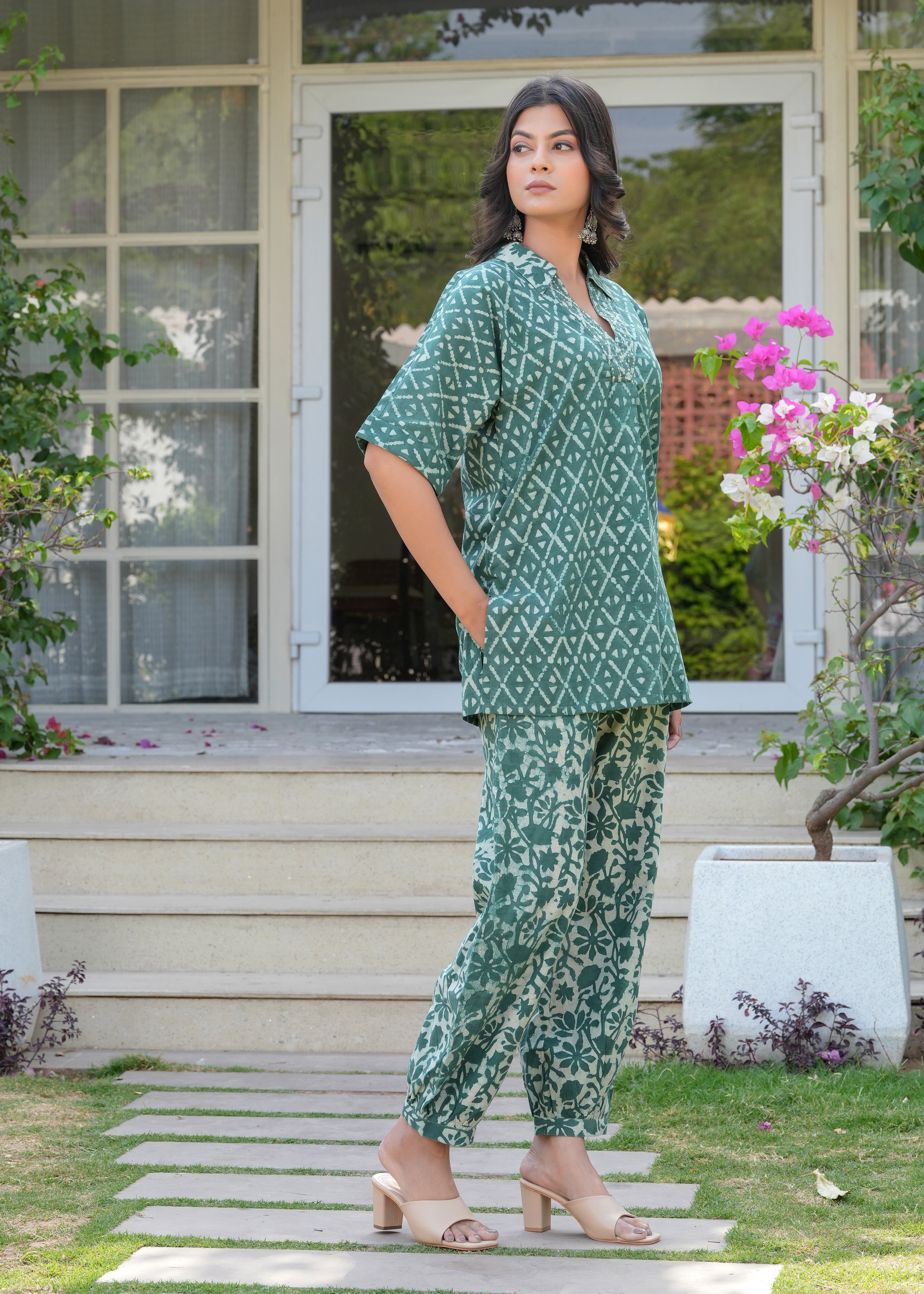 Artisanal Tribe Sage Green Dabu Kaftan Co-ord Set - Embrace elegance with the Artisanal Tribe Sage Green Dabu Set—featuring intricate prints, a sharp collar, roll-up sleeves, sequin accents, and comfy elasticated trousers for effortless style.