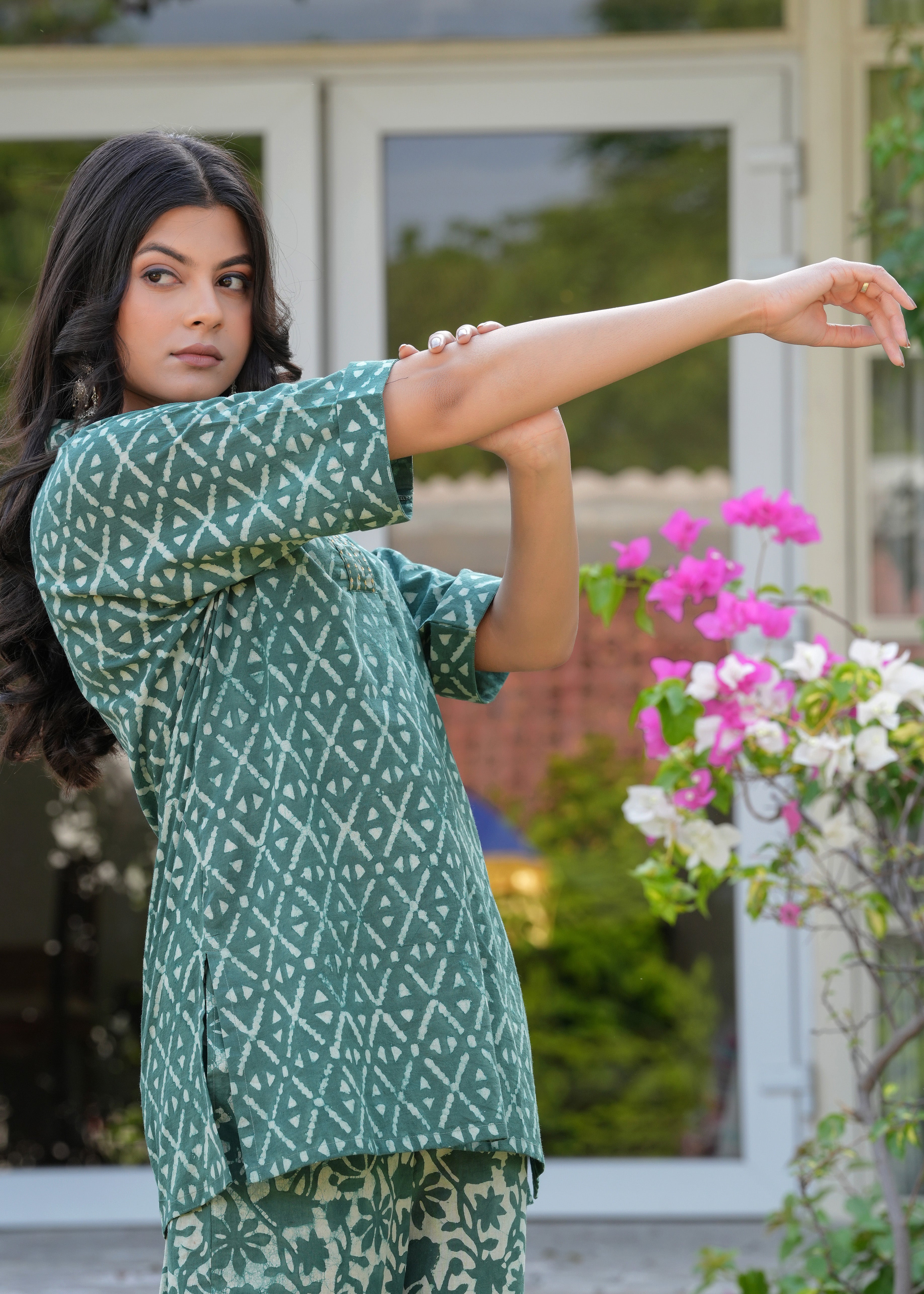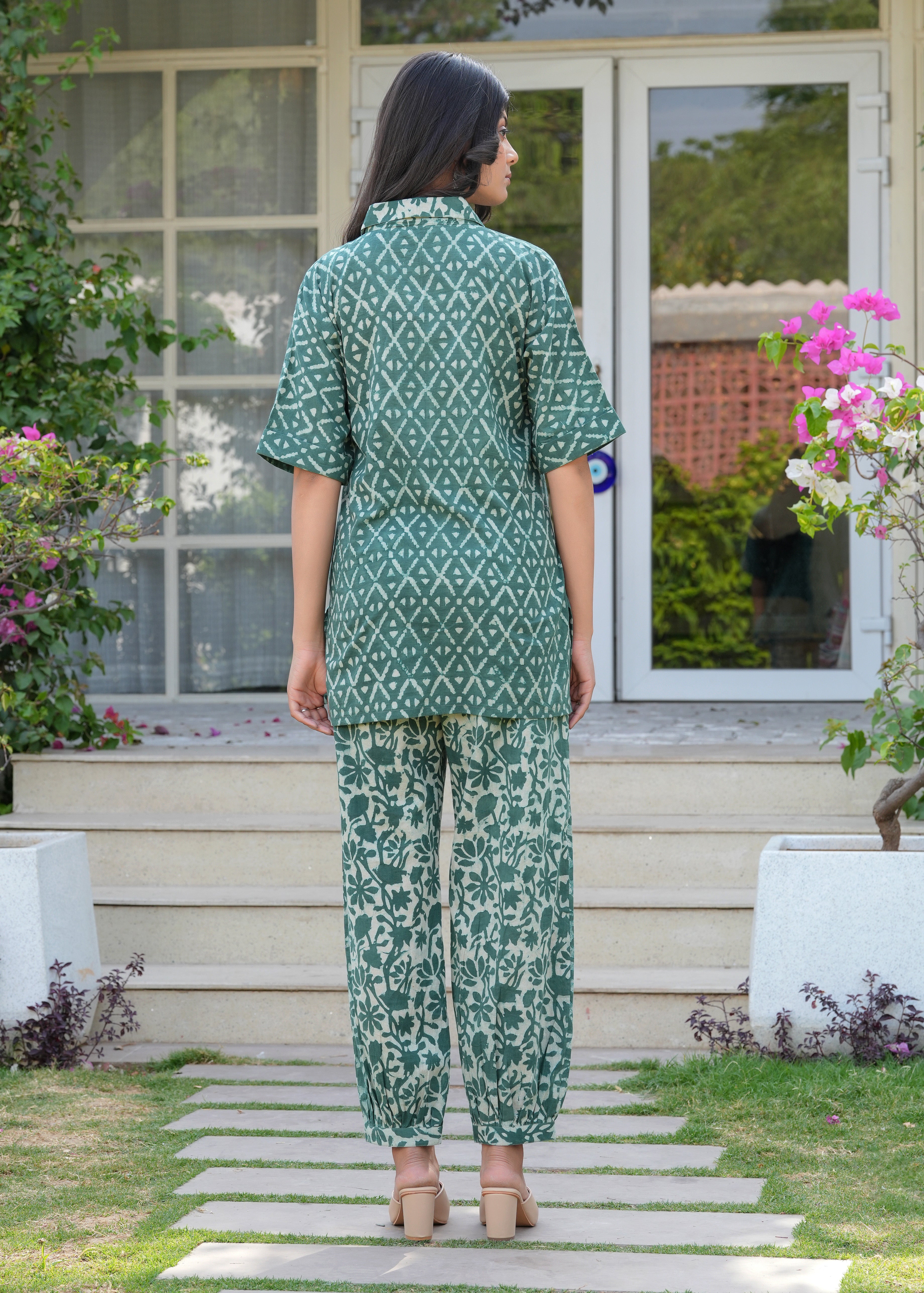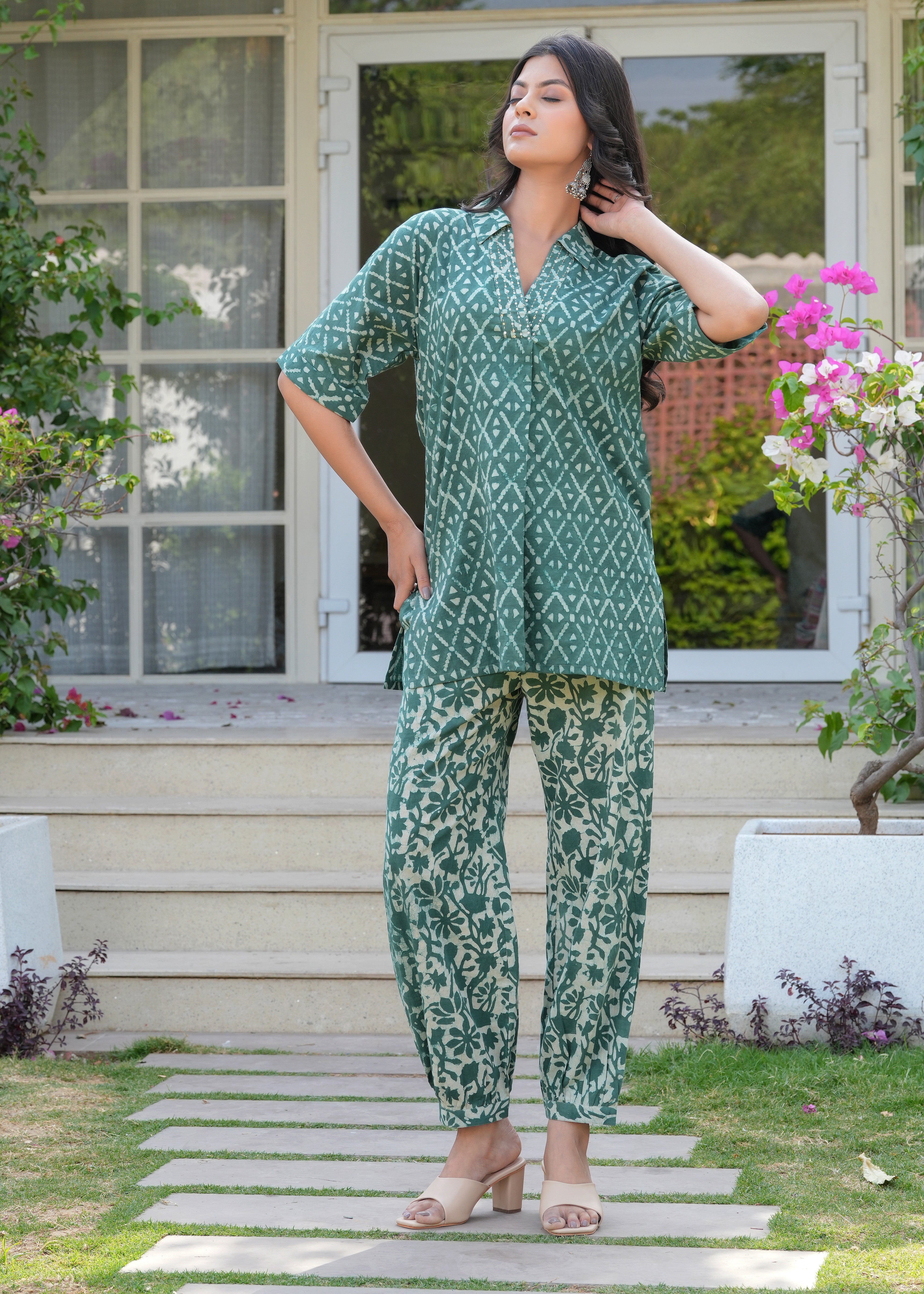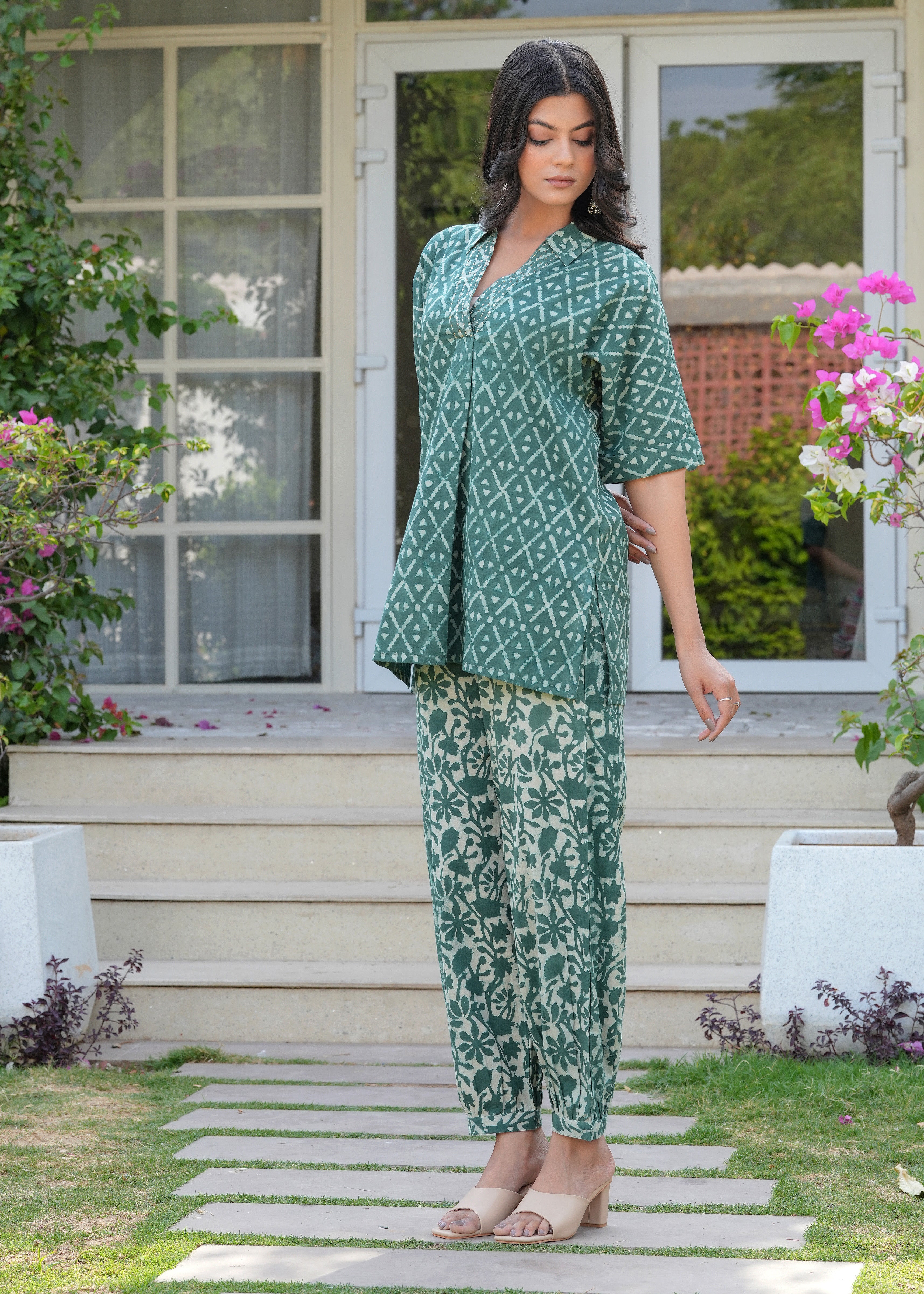 Artisanal Tribe Sage Green Dabu Kaftan Co-ord Set - Embrace elegance with the Artisanal Tribe Sage Green Dabu Set—featuring intricate prints, a sharp collar, roll-up sleeves, sequin accents, and comfy elasticated trousers for effortless style.