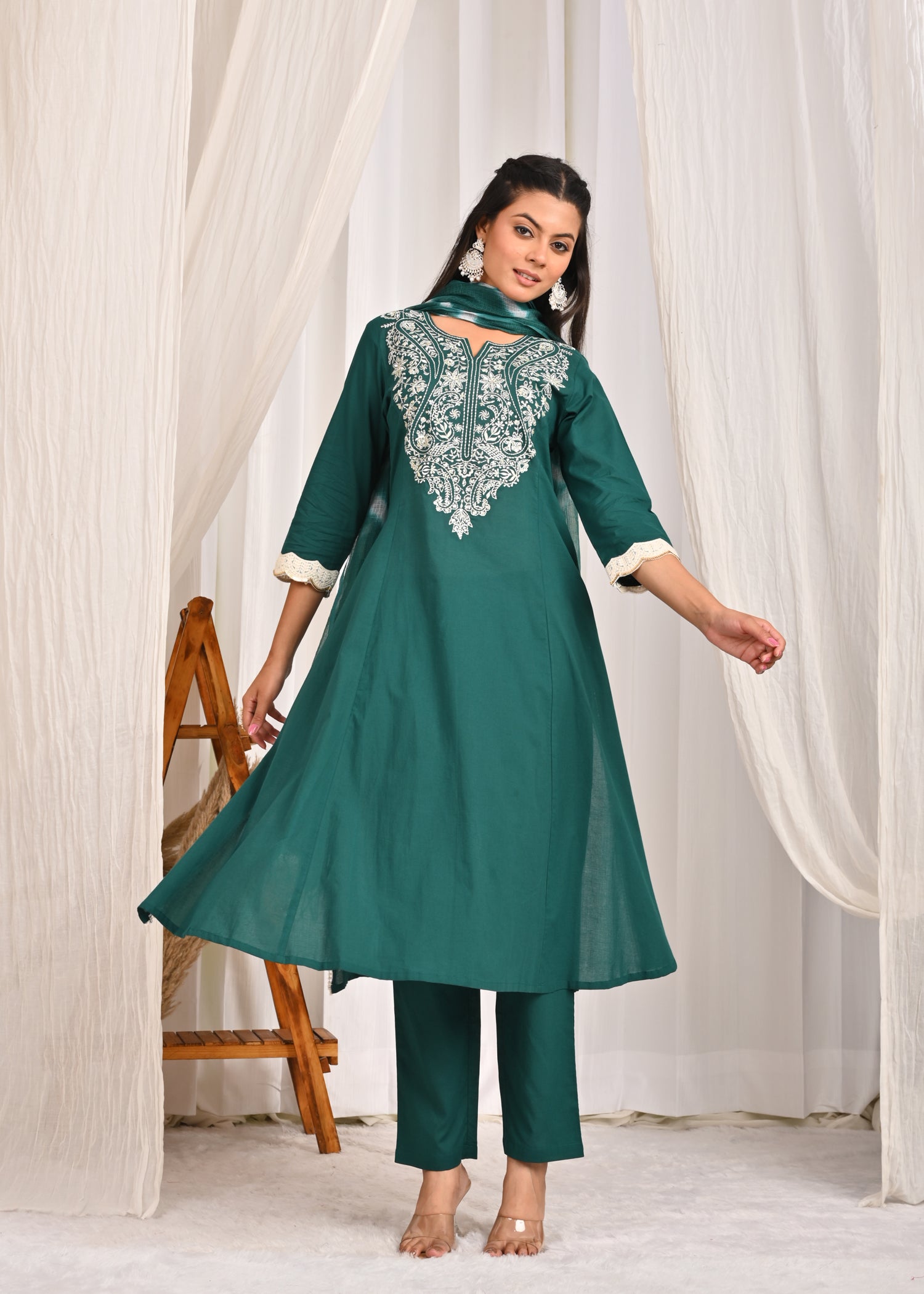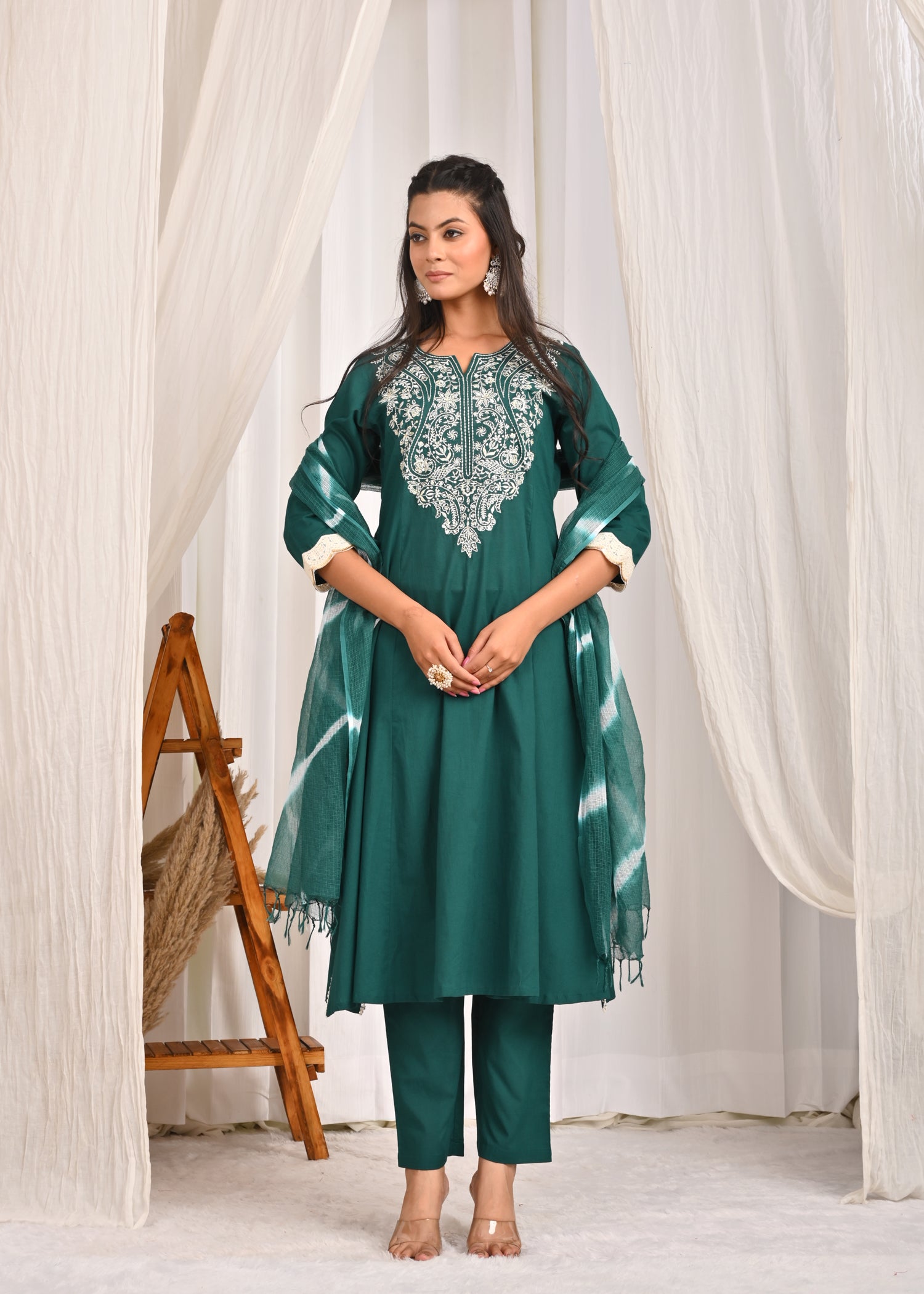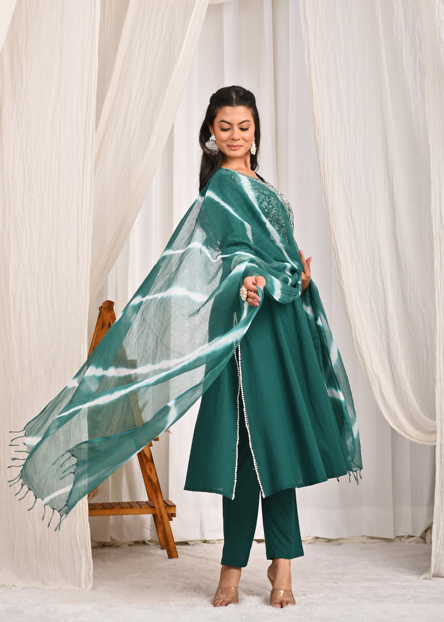 Rangmanch Samrag Embroidered A-Line Kurta Set with Leheriya Dupatta - Brighten your wardrobe with this exquisite Dark Green Pure Cotton Kurta Set. The kurta, crafted from comfortable cotton, features an elegant round neckline and a beautifully embroidered yoke with fine Resham embroidery. Delicate crochet lace detailing finishes the look, perfectly complementing the solid pants and the vibrant Leheriya Tie & Dye Kota Doria Dupatta. This ensemble is a celebration of festive color and refined craftsmanship.