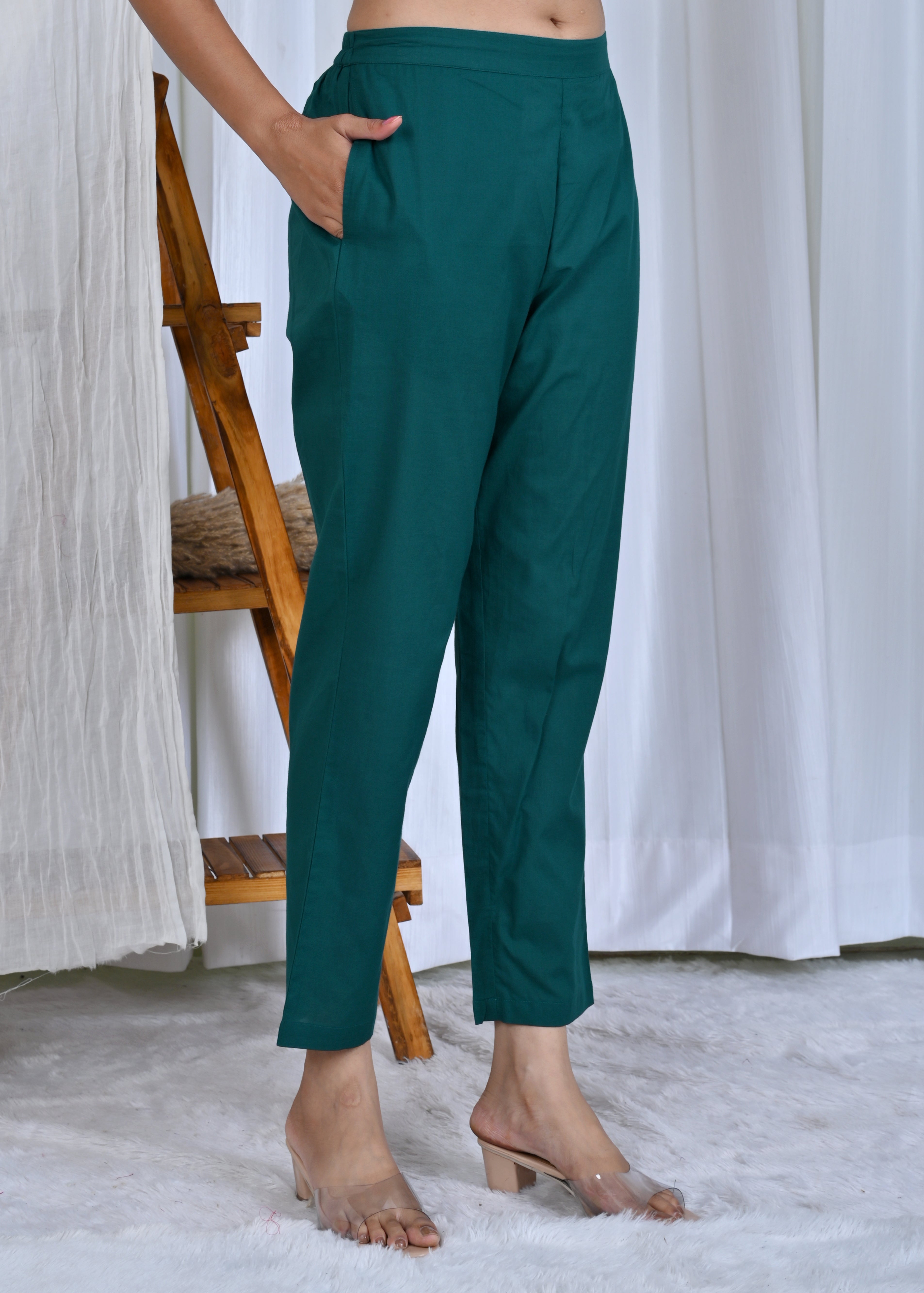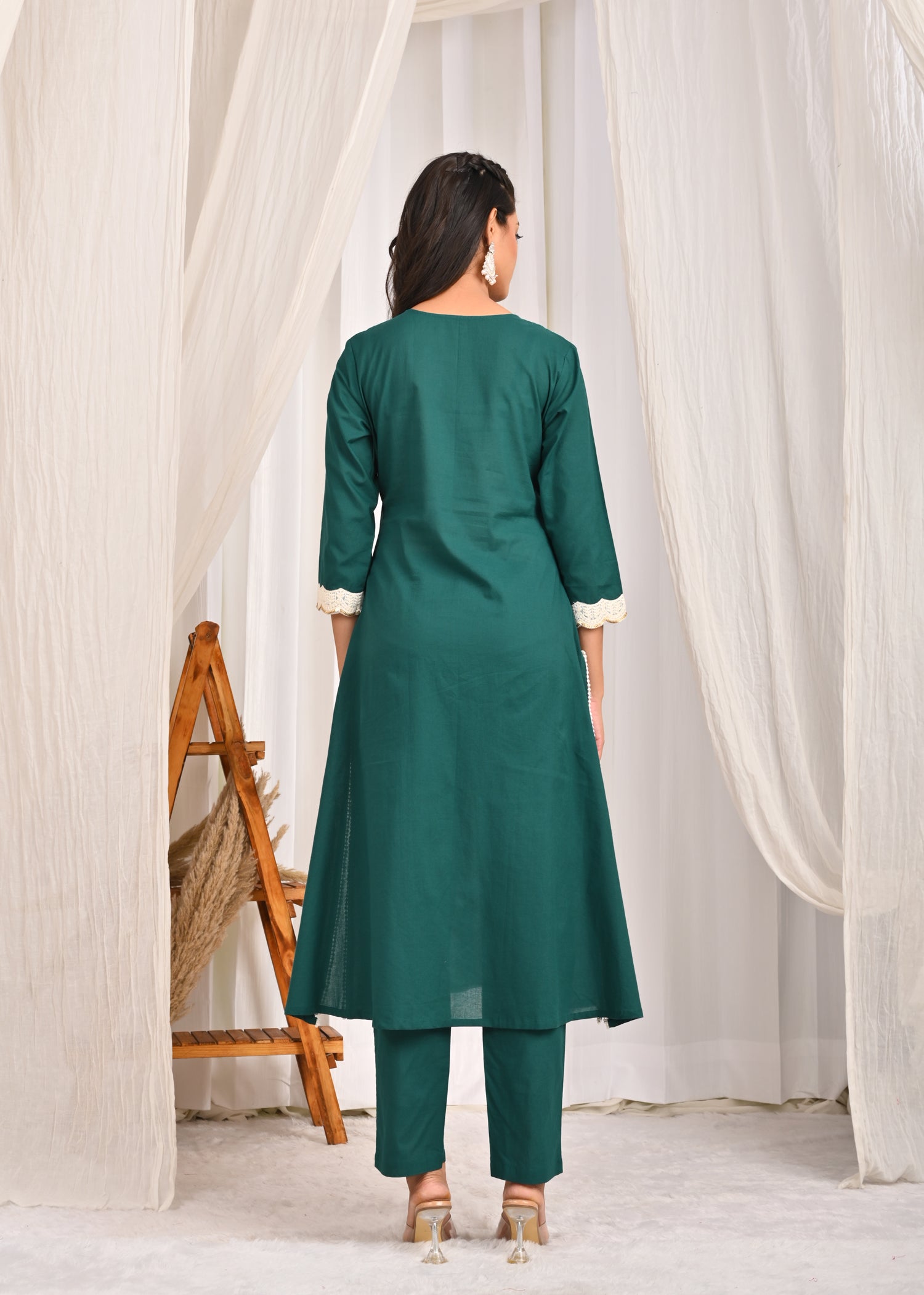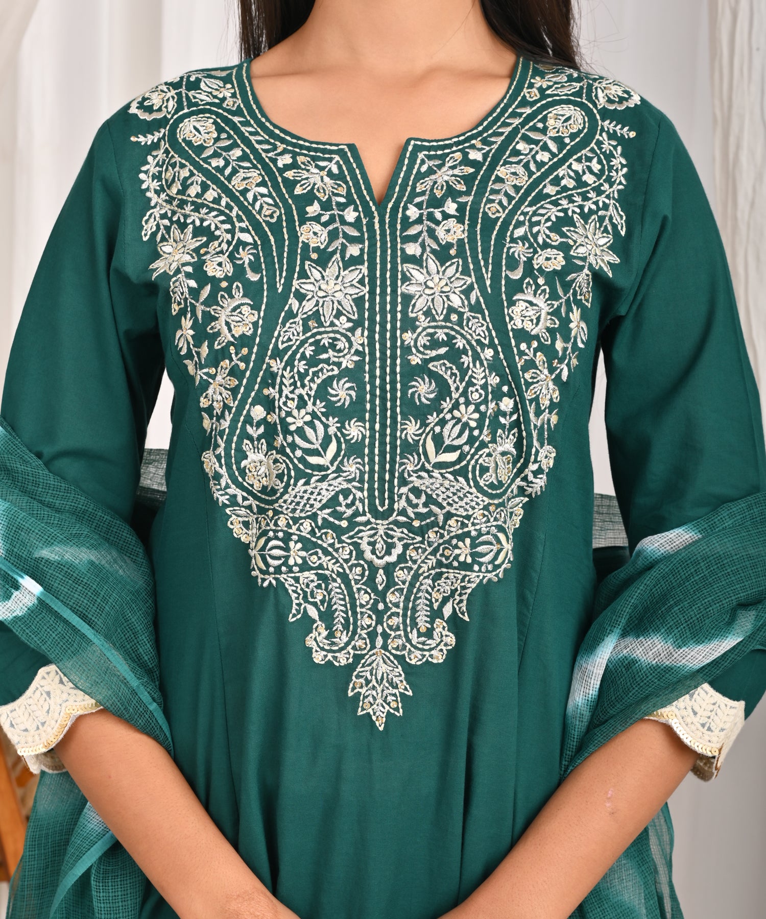 Rangmanch Samrag Embroidered A-Line Kurta Set with Leheriya Dupatta - Brighten your wardrobe with this exquisite Dark Green Pure Cotton Kurta Set. The kurta, crafted from comfortable cotton, features an elegant round neckline and a beautifully embroidered yoke with fine Resham embroidery. Delicate crochet lace detailing finishes the look, perfectly complementing the solid pants and the vibrant Leheriya Tie & Dye Kota Doria Dupatta. This ensemble is a celebration of festive color and refined craftsmanship.