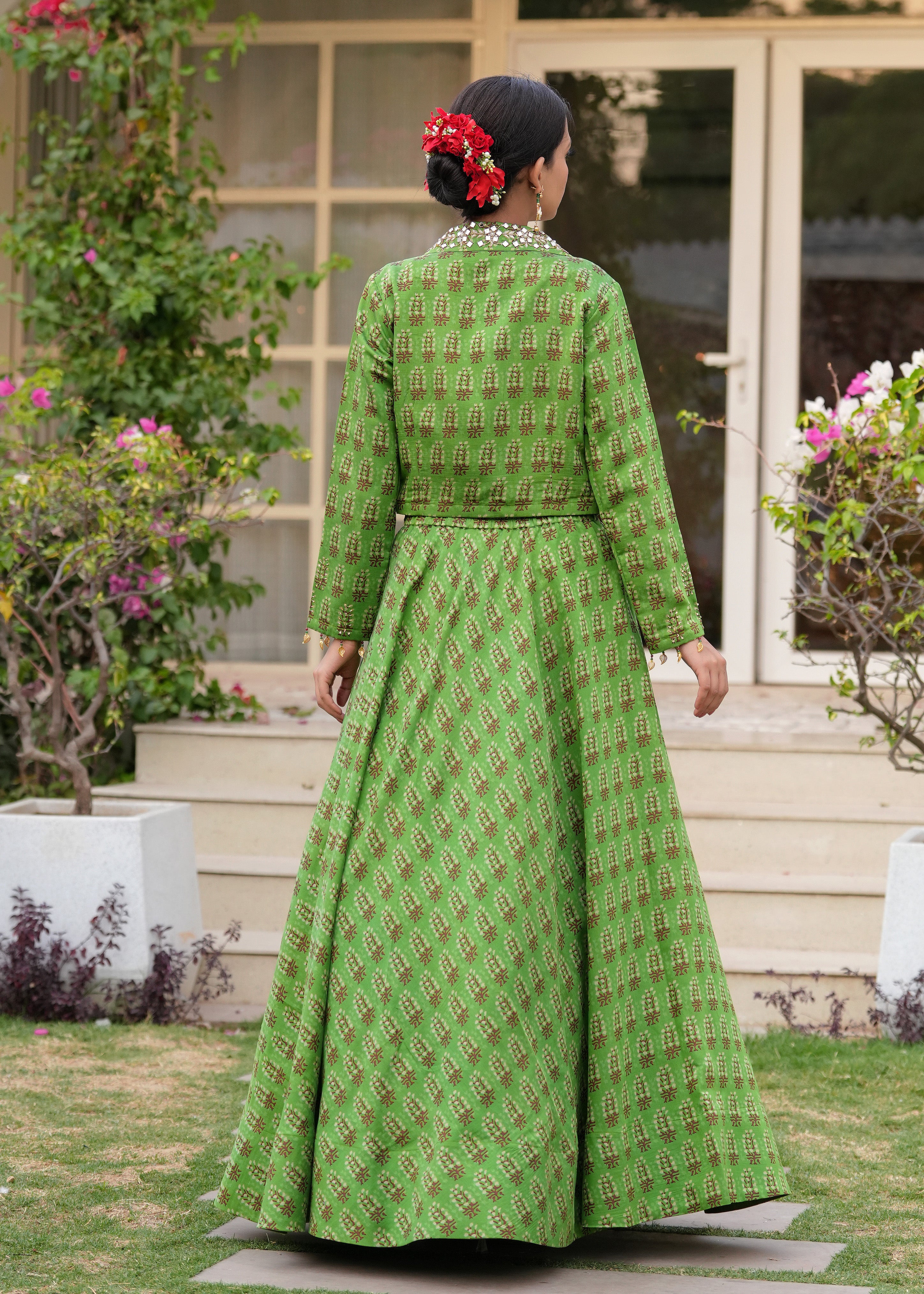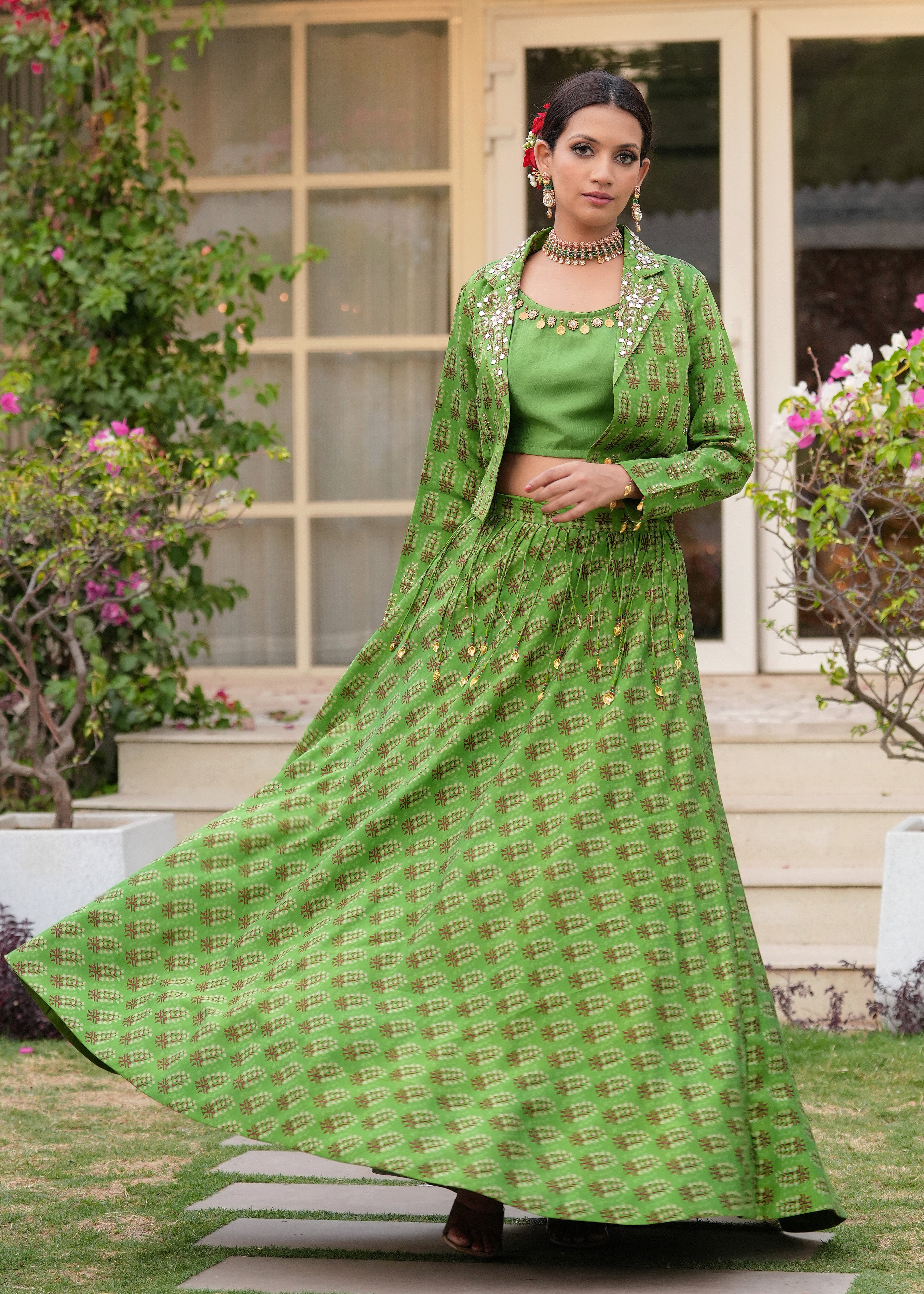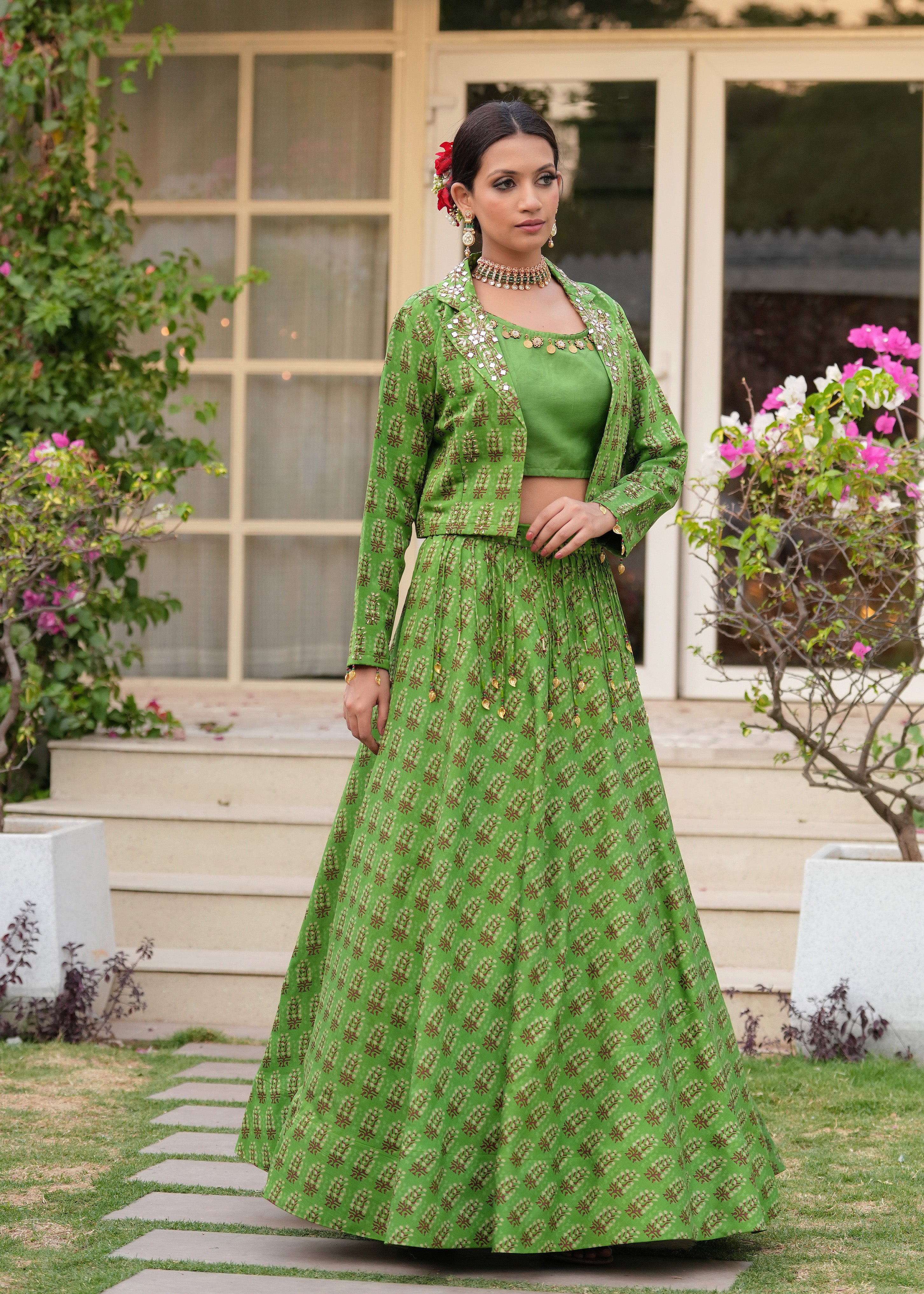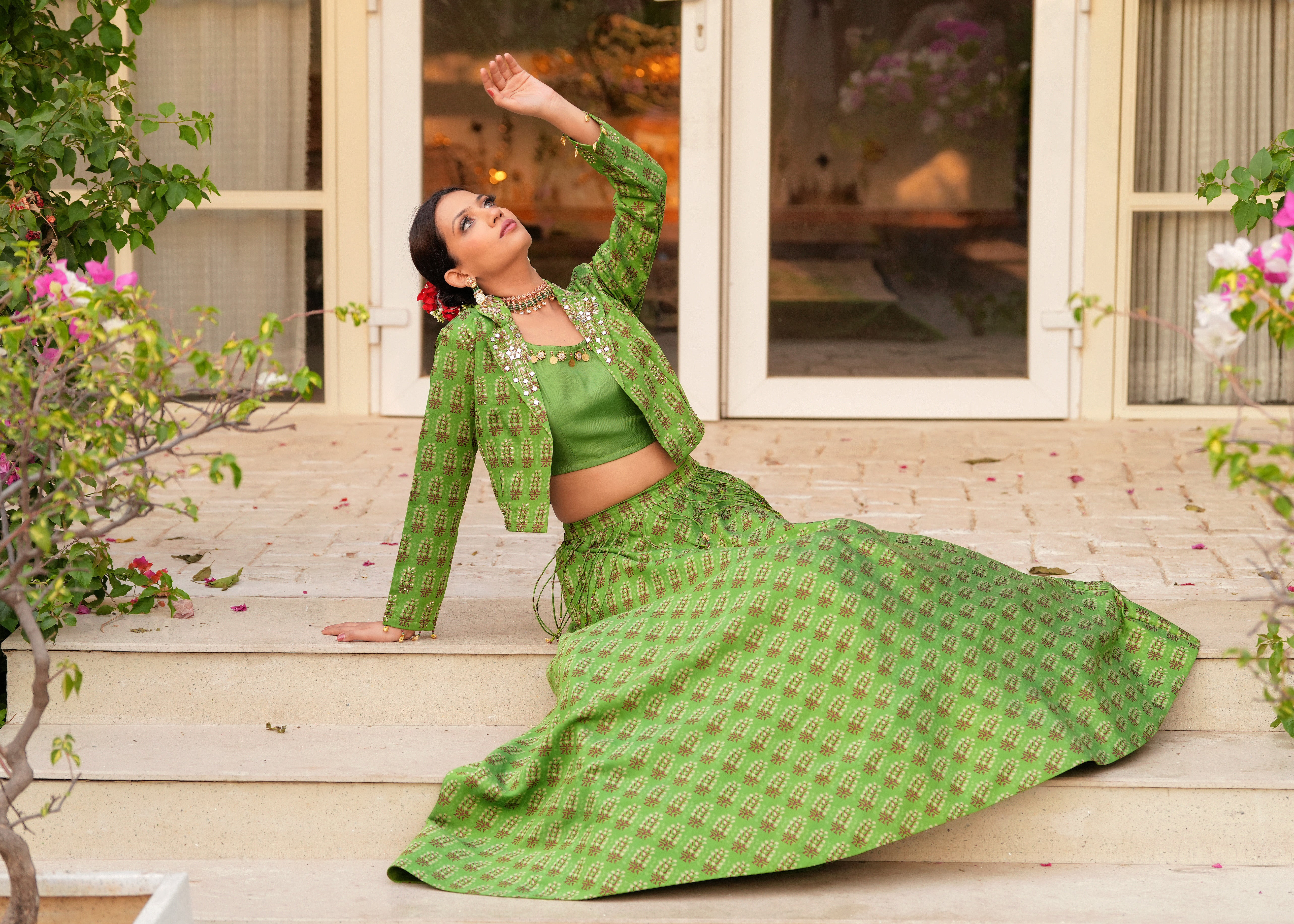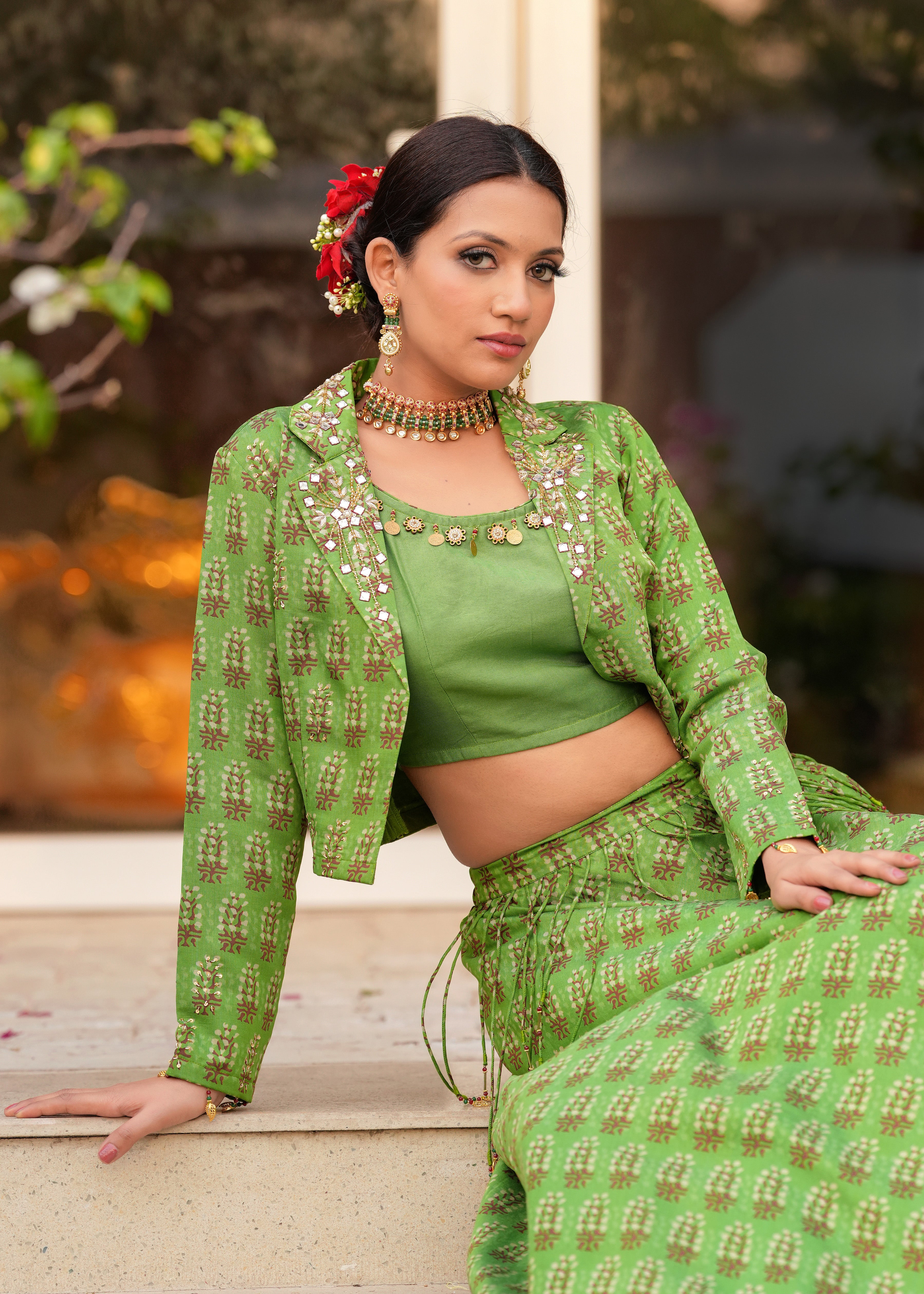Maharani Vibes Tota Green Lehenga Jacket Fusion Set- Step into festive grace with this Tota green Chanderi silk lehenga set, featuring a printed fringe lehenga, embellished sleeveless crop top, and a sequined, beaded embroidered jacket, an impeccable blend of tradition and contemporary elegance.