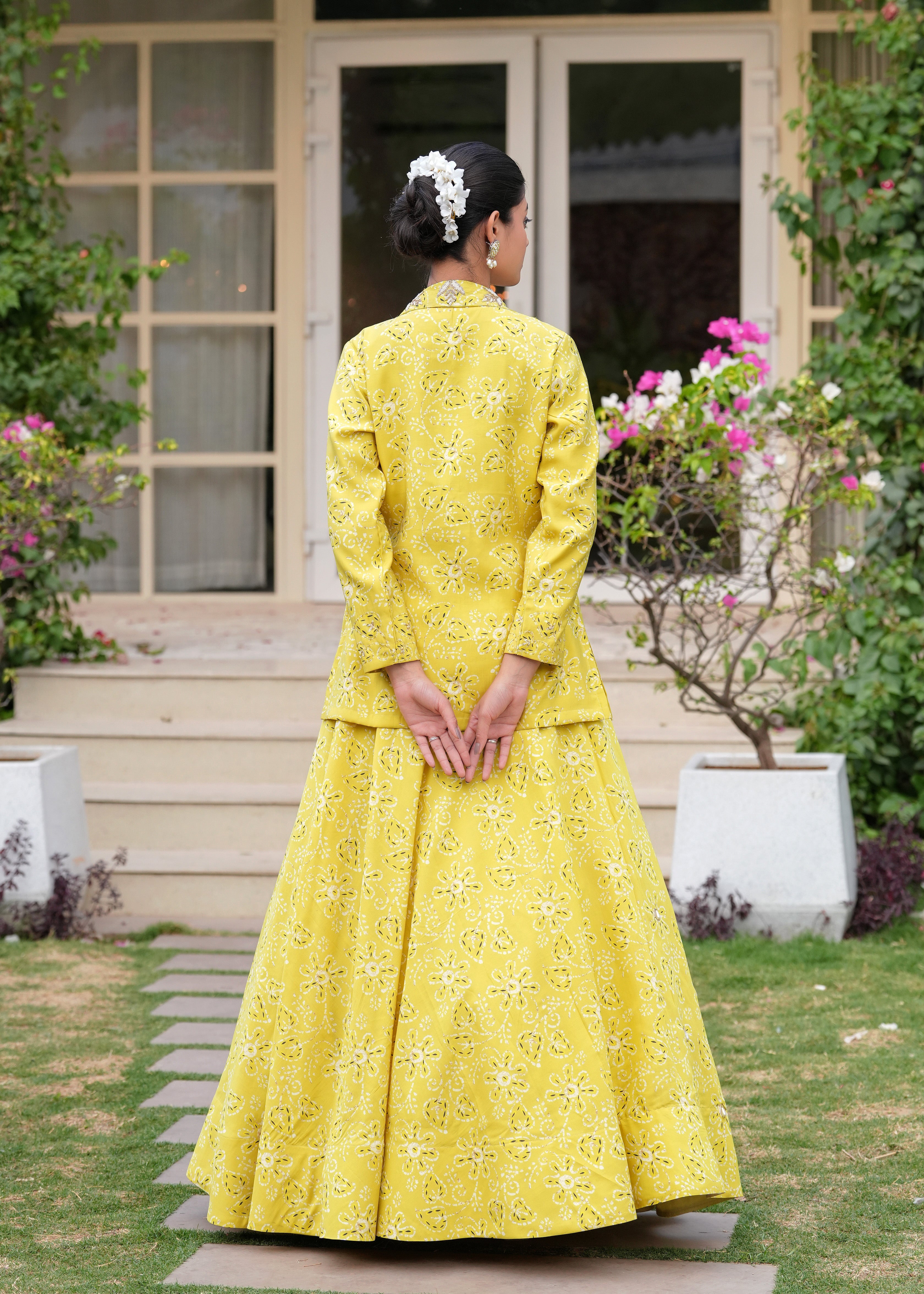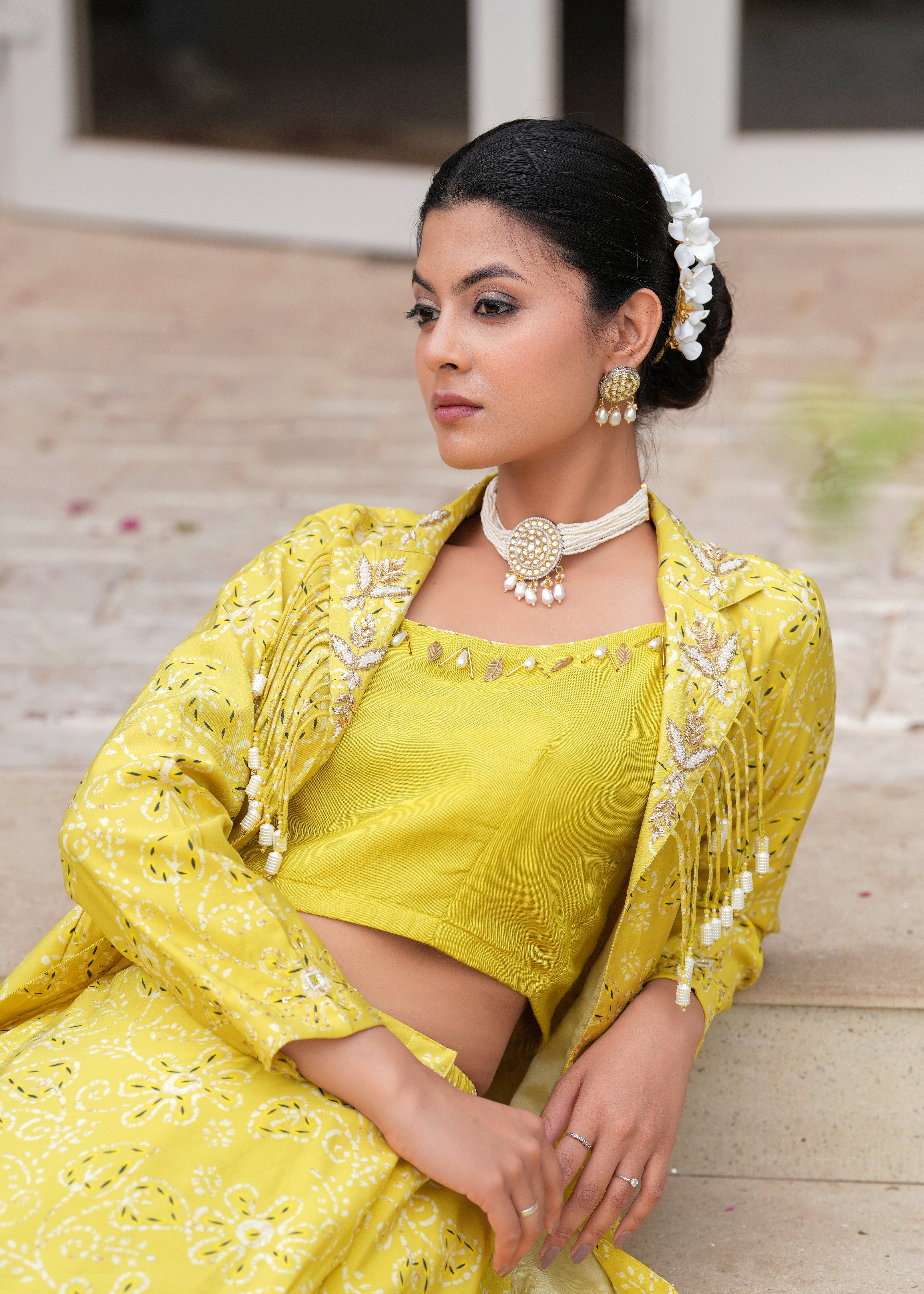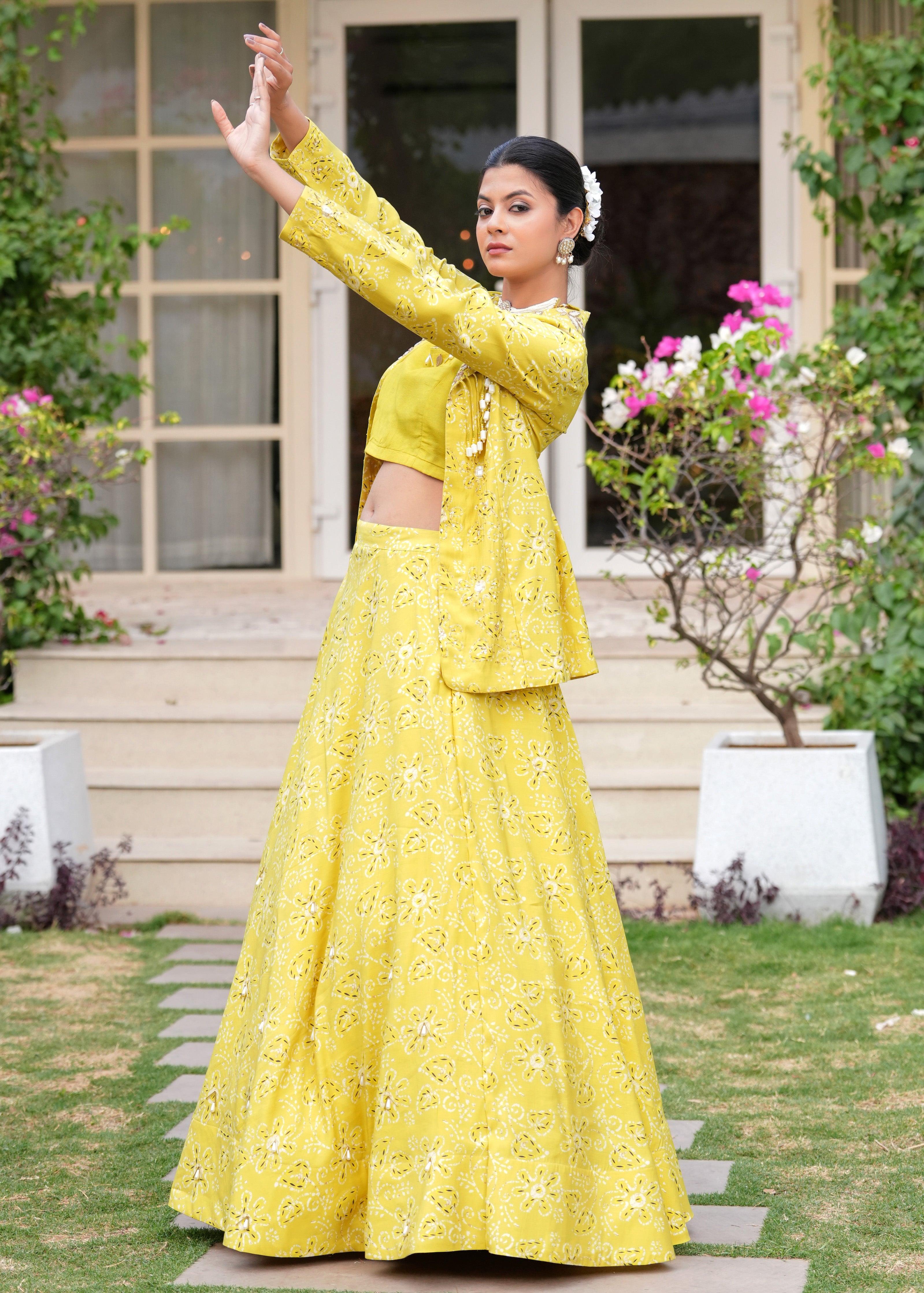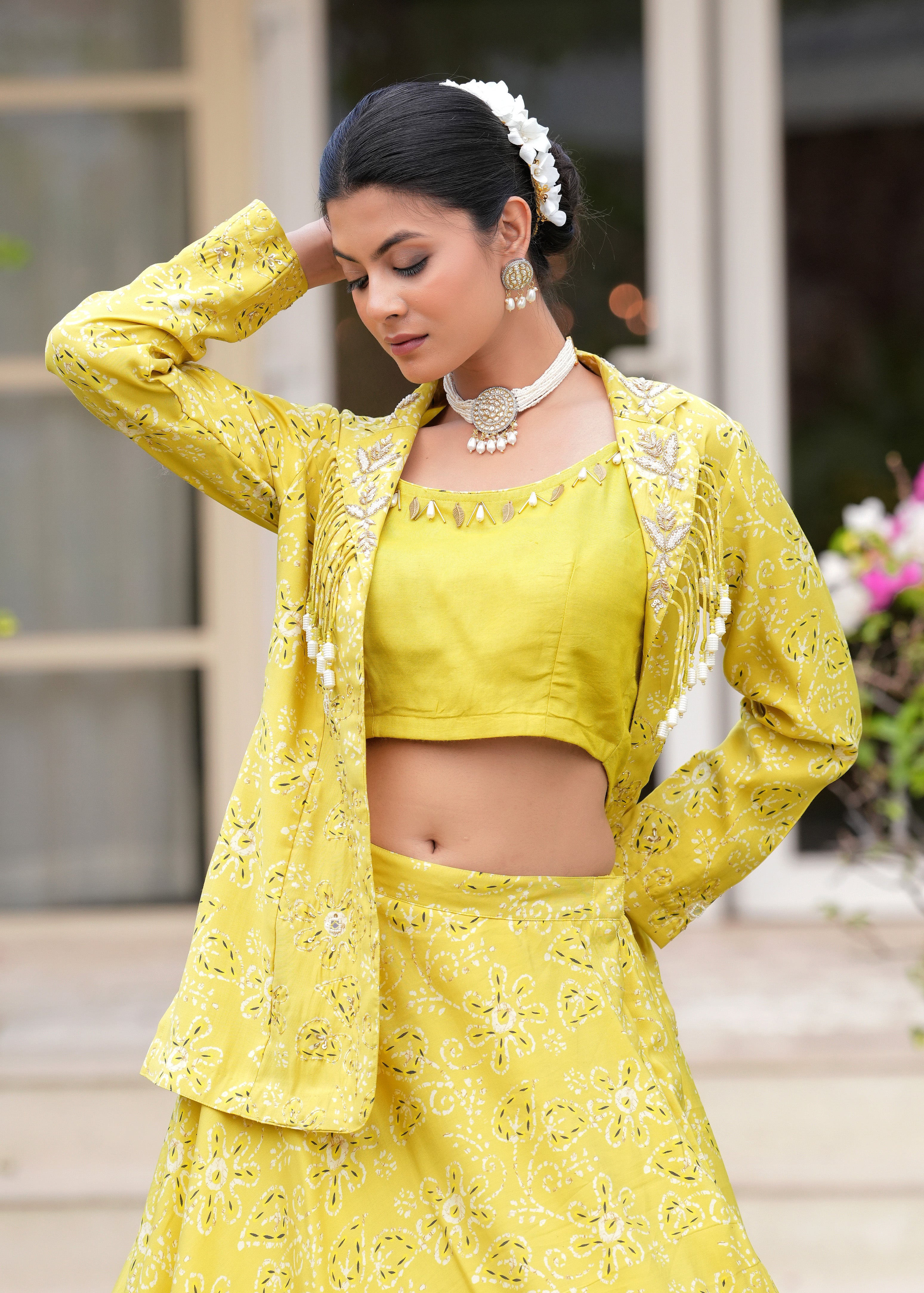 Maharani Vibes Yellow Marigold Lehenga Jacket Fusion Set - Embody royal allure in this marigold Chanderi silk lehenga set, featuring a vibrant printed skirt with elastic waist, a pearl-embellished crop top, and a long, intricately embroidered Zardozi jacket,an exquisite fusion of tradition and modern elegance..