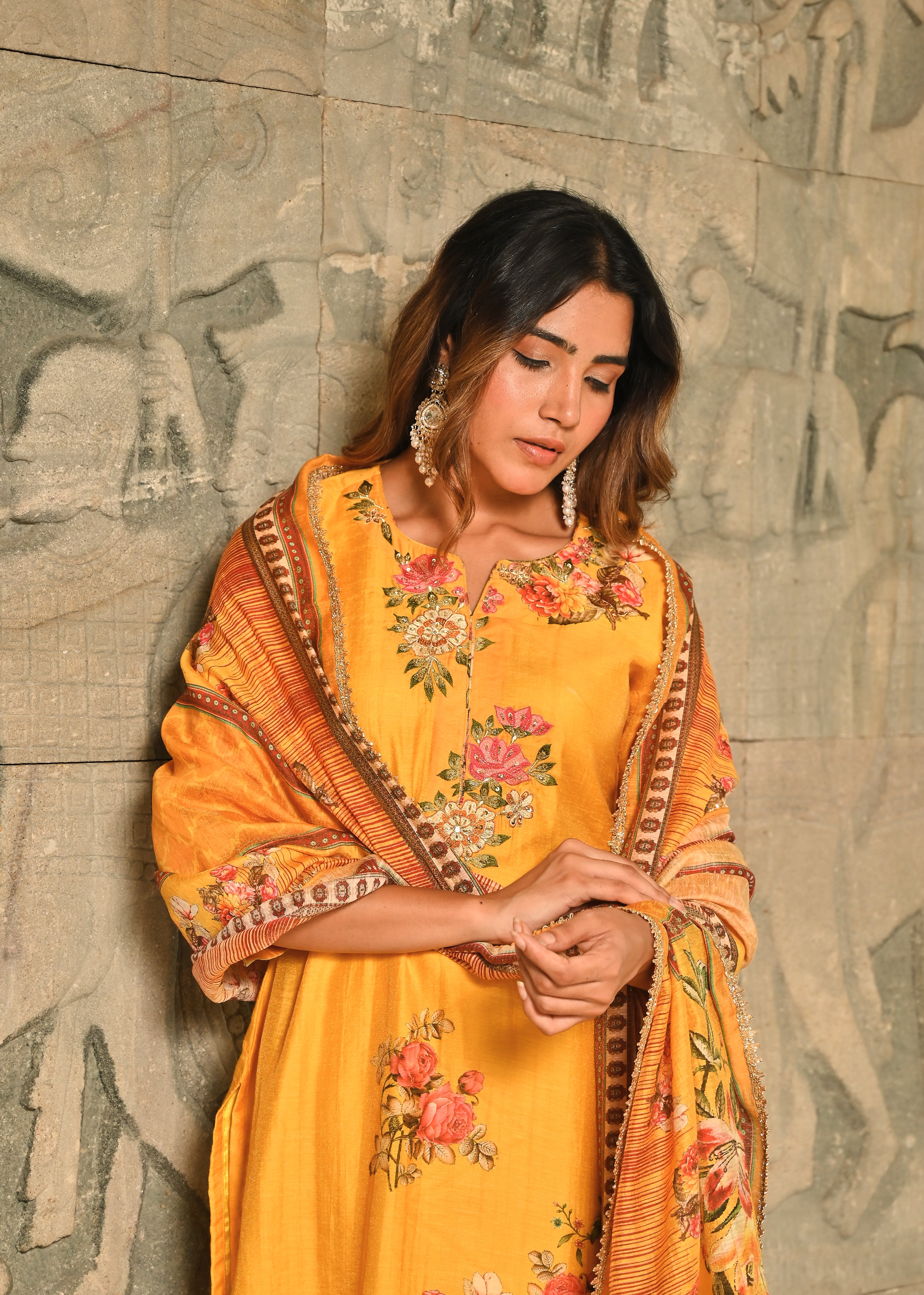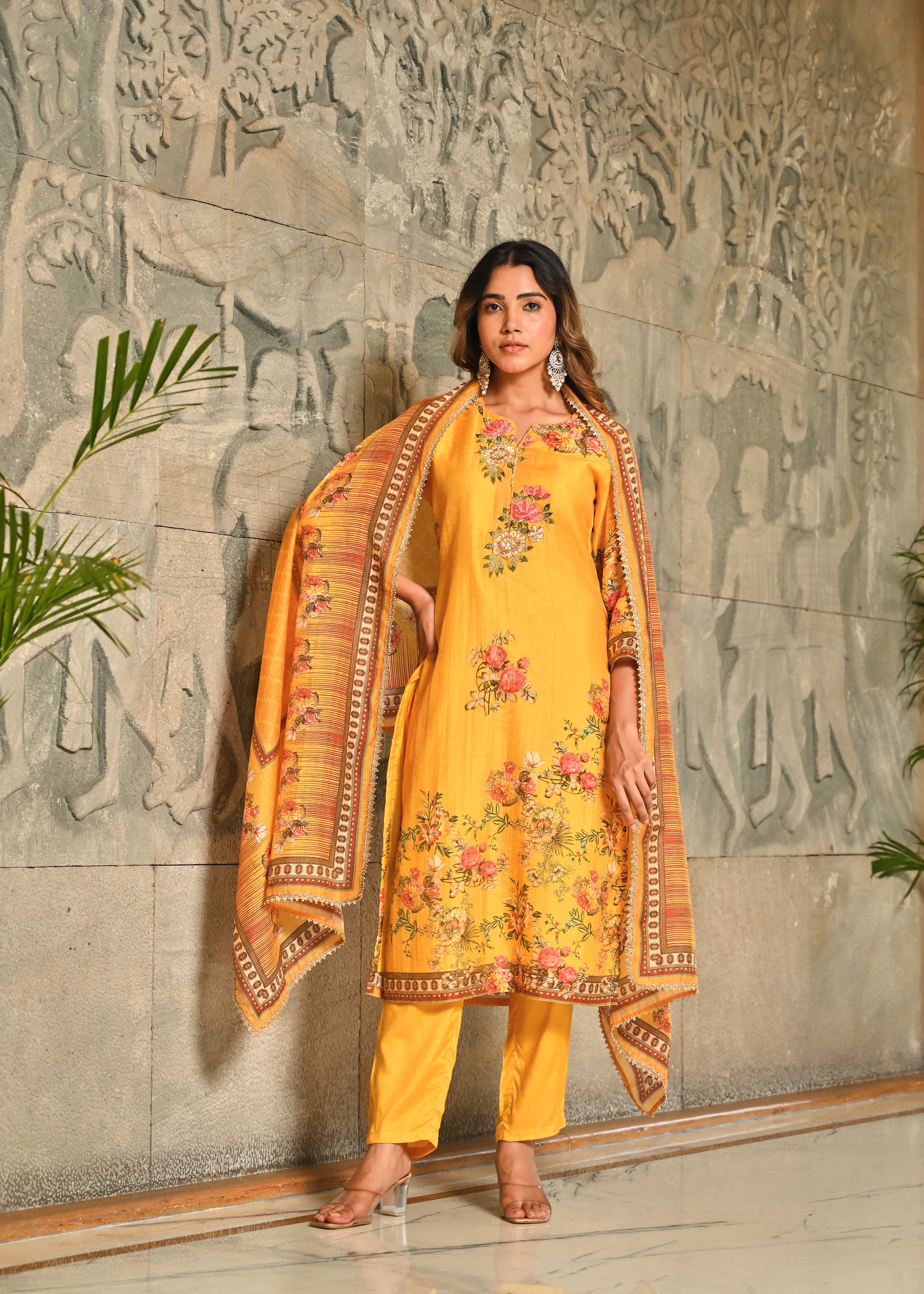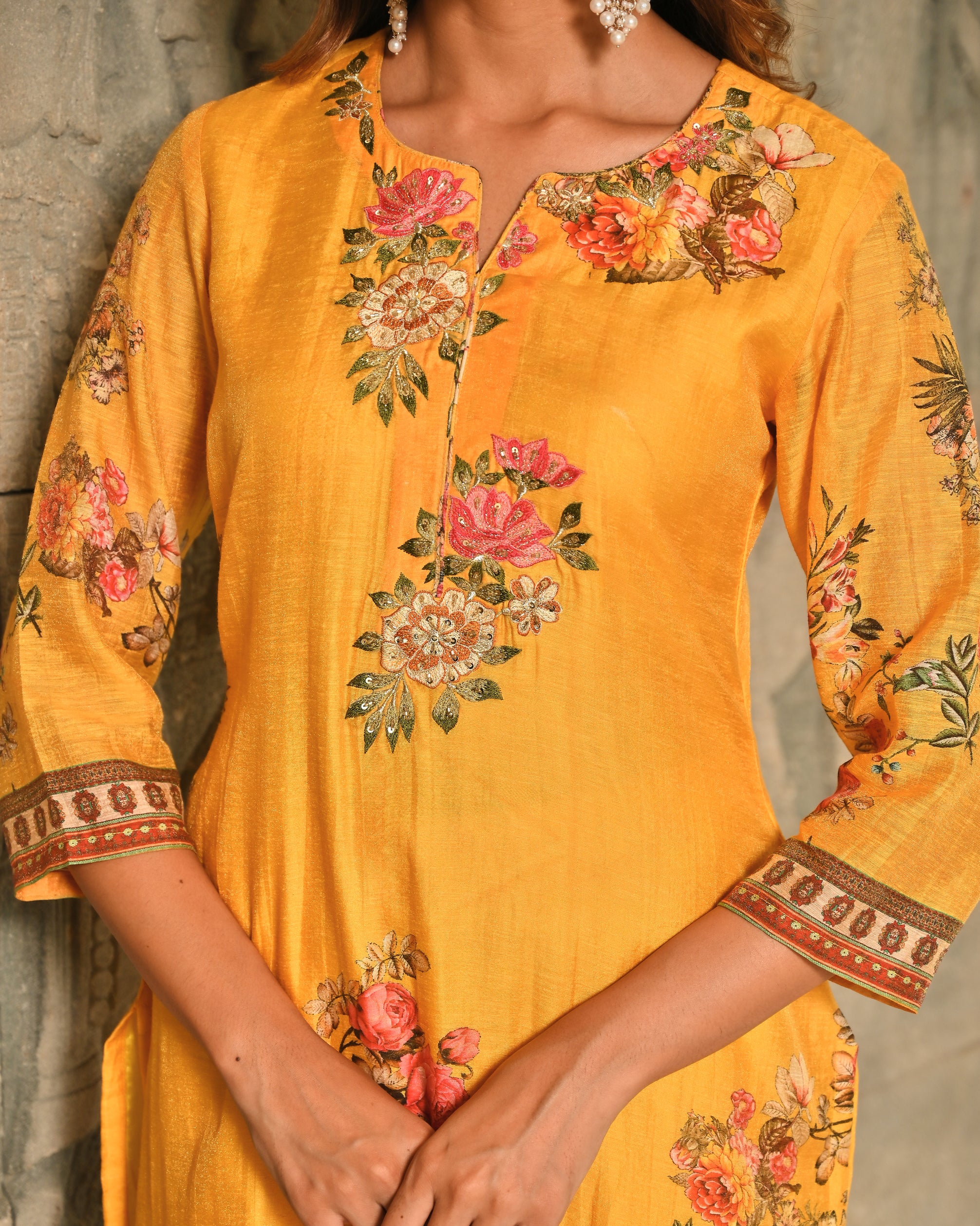 Floral Panache Yellow Zari - Kari & Phool Silk Kurta Dupatta Set- Drape yourself in the soft splendor of this exquisite Yellow Kurta-Dupatta Set. Crafted from luxurious Aurum Silk, the kurta features a classic round neckline. The beauty is centered on the yoke, which is beautifully accented with intricate Zari and delicate Resham hand-embroidery. Subtle floral prints adorn the front, along with coordinating solid pant. Paired with a matching silk dupatta, this set is a perfect blend of traditional artistry and contemporary grace.