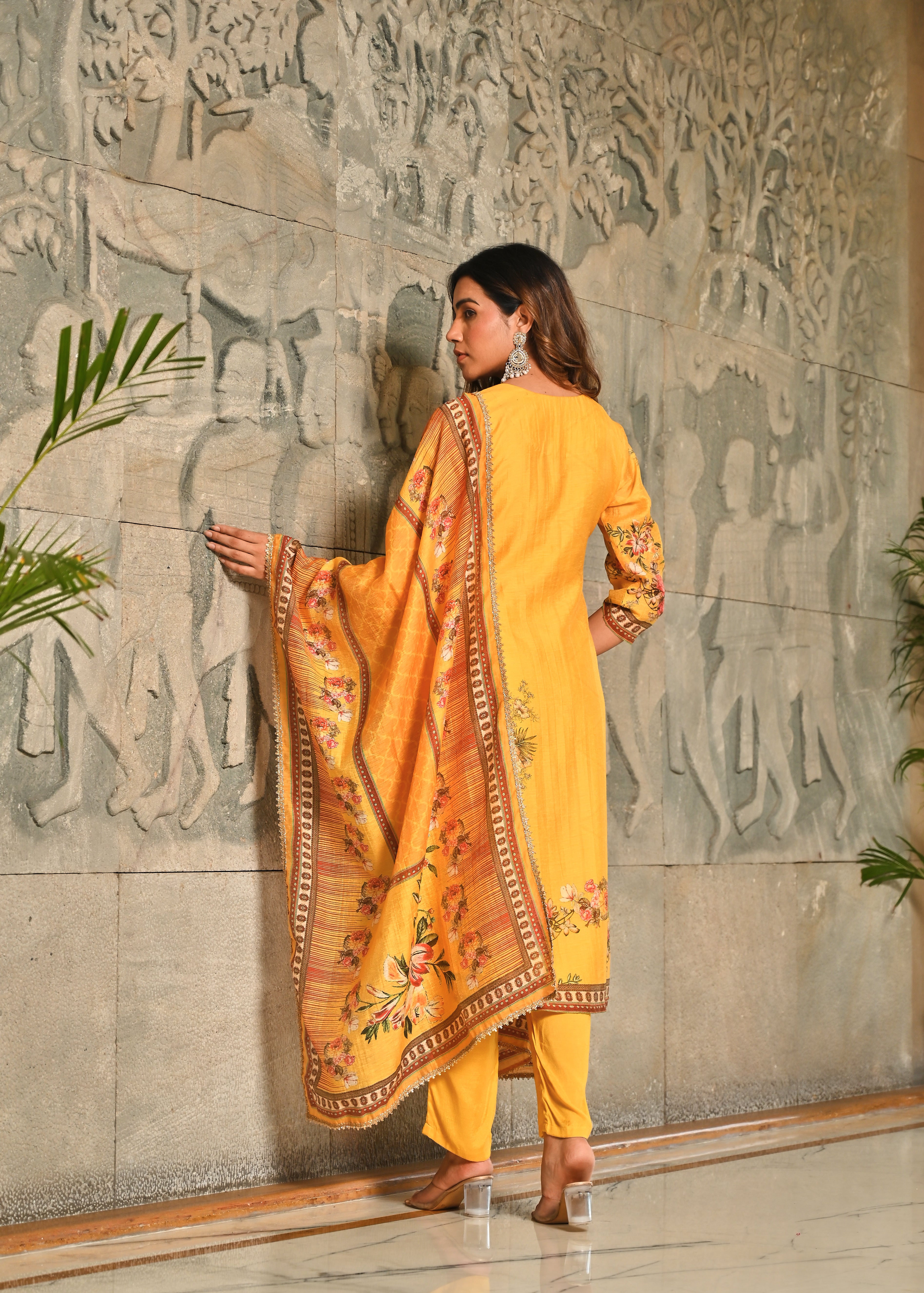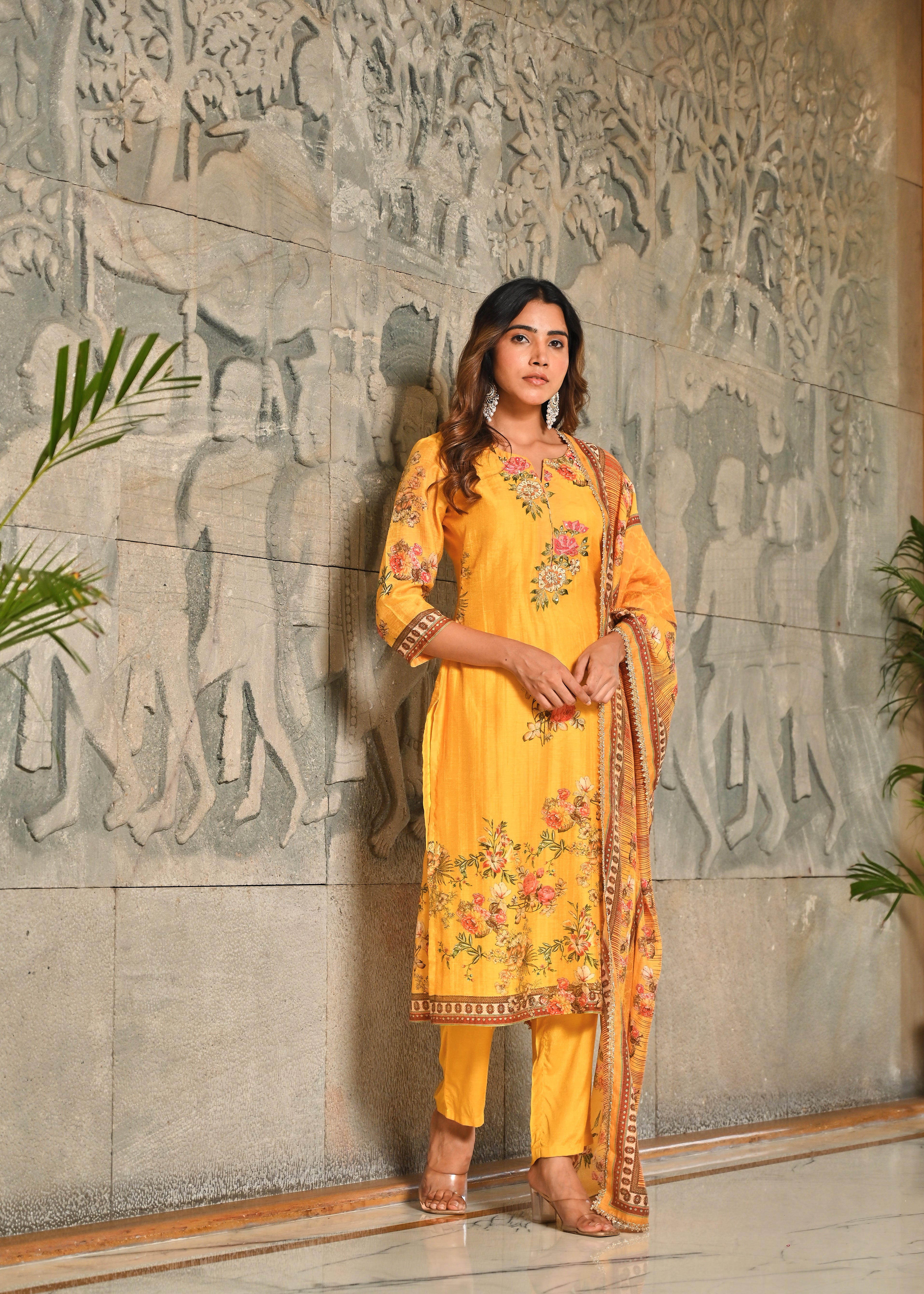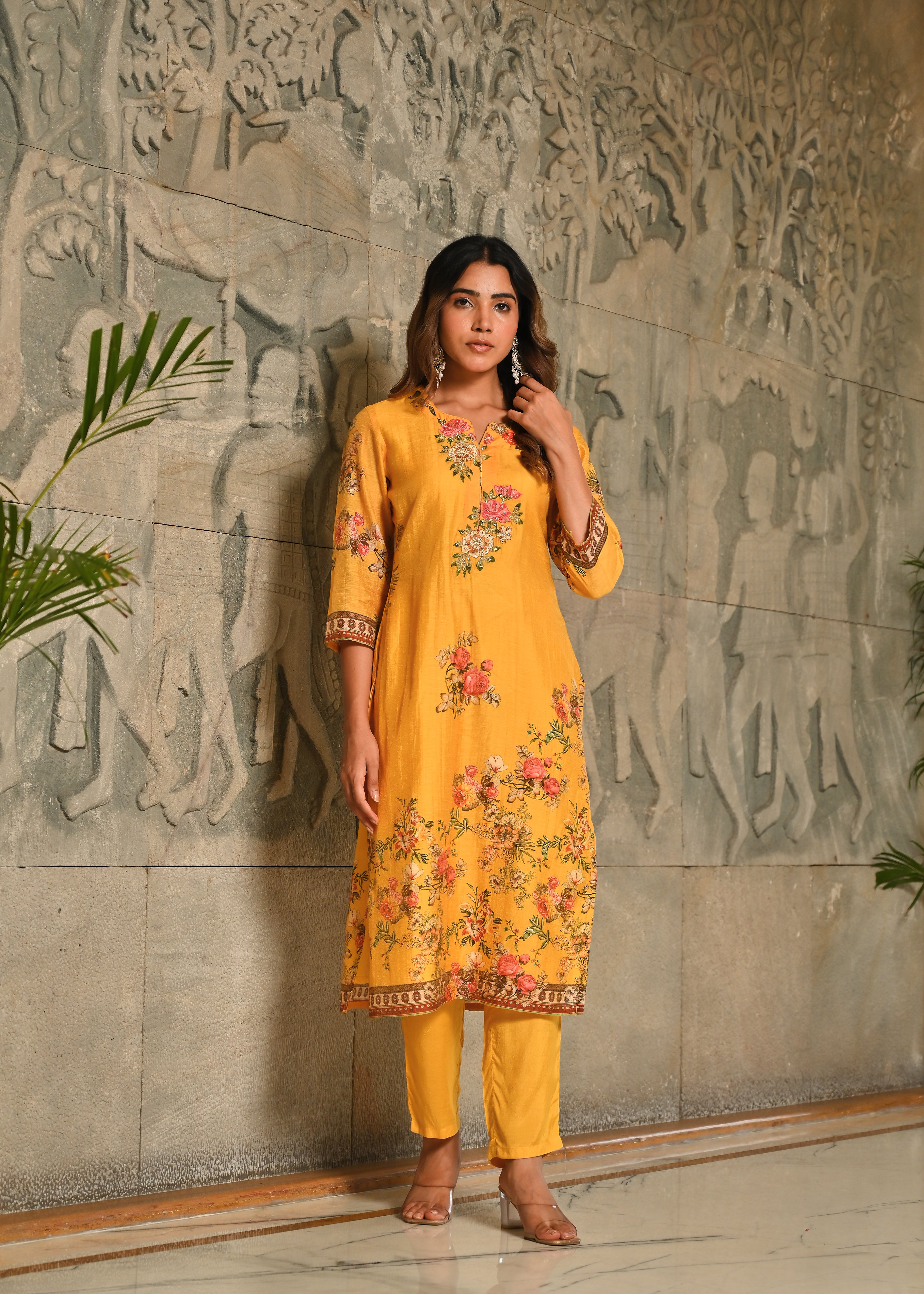 Floral Panache Yellow Zari - Kari & Phool Silk Kurta Dupatta Set- Drape yourself in the soft splendor of this exquisite Yellow Kurta-Dupatta Set. Crafted from luxurious Aurum Silk, the kurta features a classic round neckline. The beauty is centered on the yoke, which is beautifully accented with intricate Zari and delicate Resham hand-embroidery. Subtle floral prints adorn the front, along with coordinating solid pant. Paired with a matching silk dupatta, this set is a perfect blend of traditional artistry and contemporary grace.